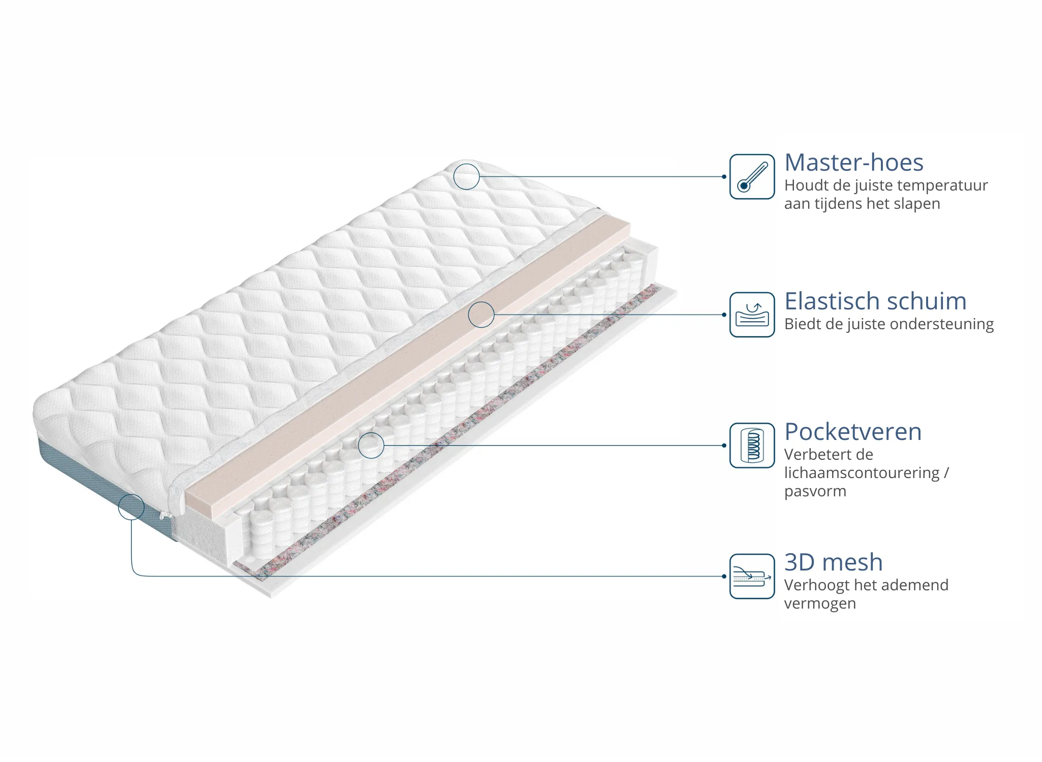 | Vulling | Hoos Master stof + 3D net 1 cm; Multipocket veren 8 cm; Vilt; Polyurethaan schuim 4 cm |