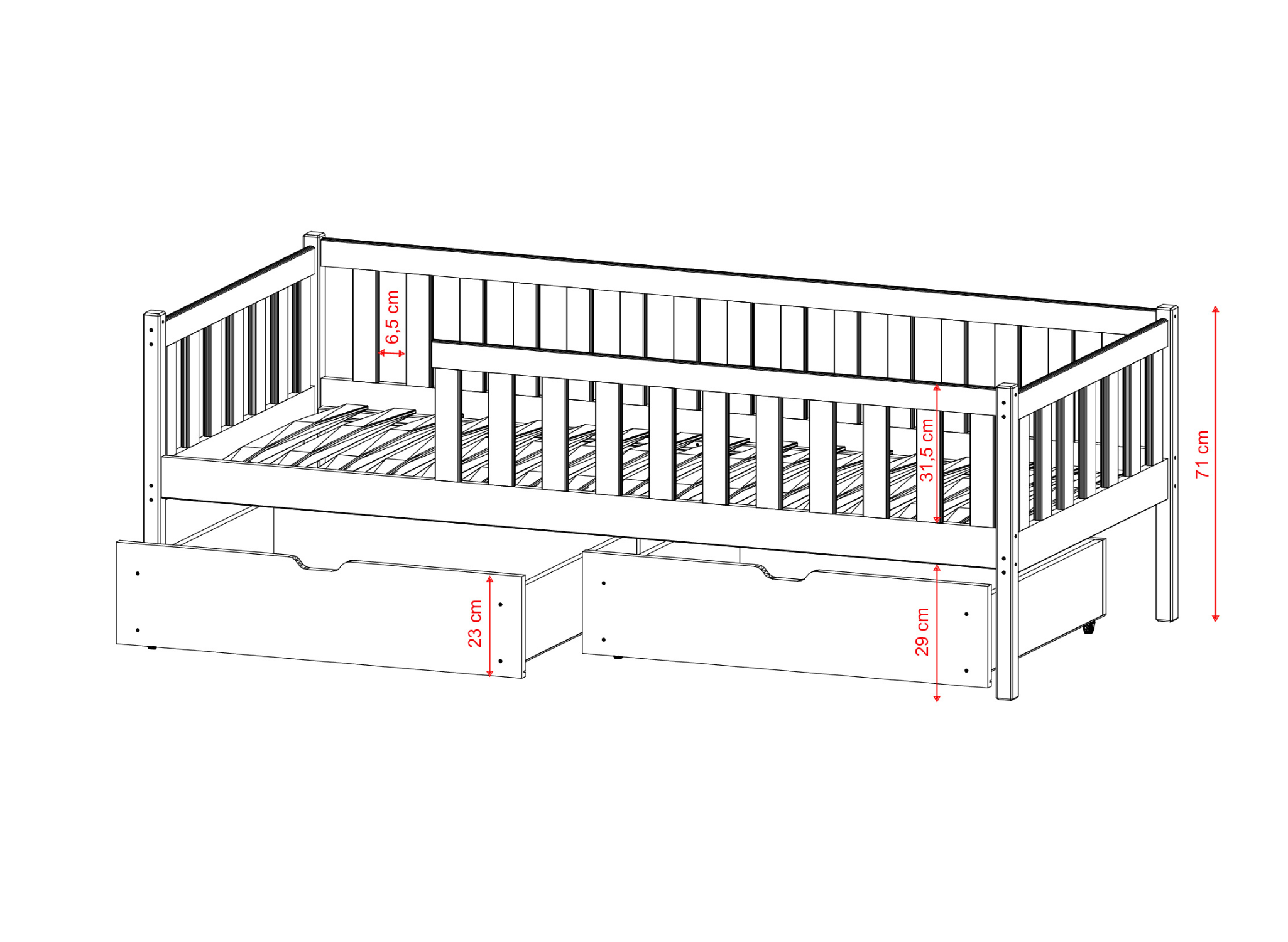 Kinderbed ANTONIO is uitgerust met twee ruime lades – een praktische opbergoplossing die het dagelijks leven makkelijker maakt voor zowel kind als ouder. Dankzij deze lades zijn alle kinderschatten – van knuffels en boeken tot blokken en extra beddengoed – altijd binnen handbereik, maar nooit in het zicht. De lades onder het bed maken het eenvoudig om snel orde te scheppen, zonder extra manden, dozen of kasten. Je kind kan zelf zijn of haar spullen opbergen en eruit halen, wat helpt bij het ontwikkelen van dagelijkse gewoontes en een gevoel van verantwoordelijkheid stimuleert. De lades zijn zo ontworpen dat ze het spelen niet in de weg staan en de bewegingsvrijheid niet beperken. Het slanke ontwerp van het ANTONIO-bed op hoge pootjes zorgt er bovendien voor dat dit model licht oogt en de kamer niet overweldigt – zelfs niet in een kleine ruimte. ANTONIO is een harmonieuze combinatie van esthetiek, ergonomie en functionaliteit.