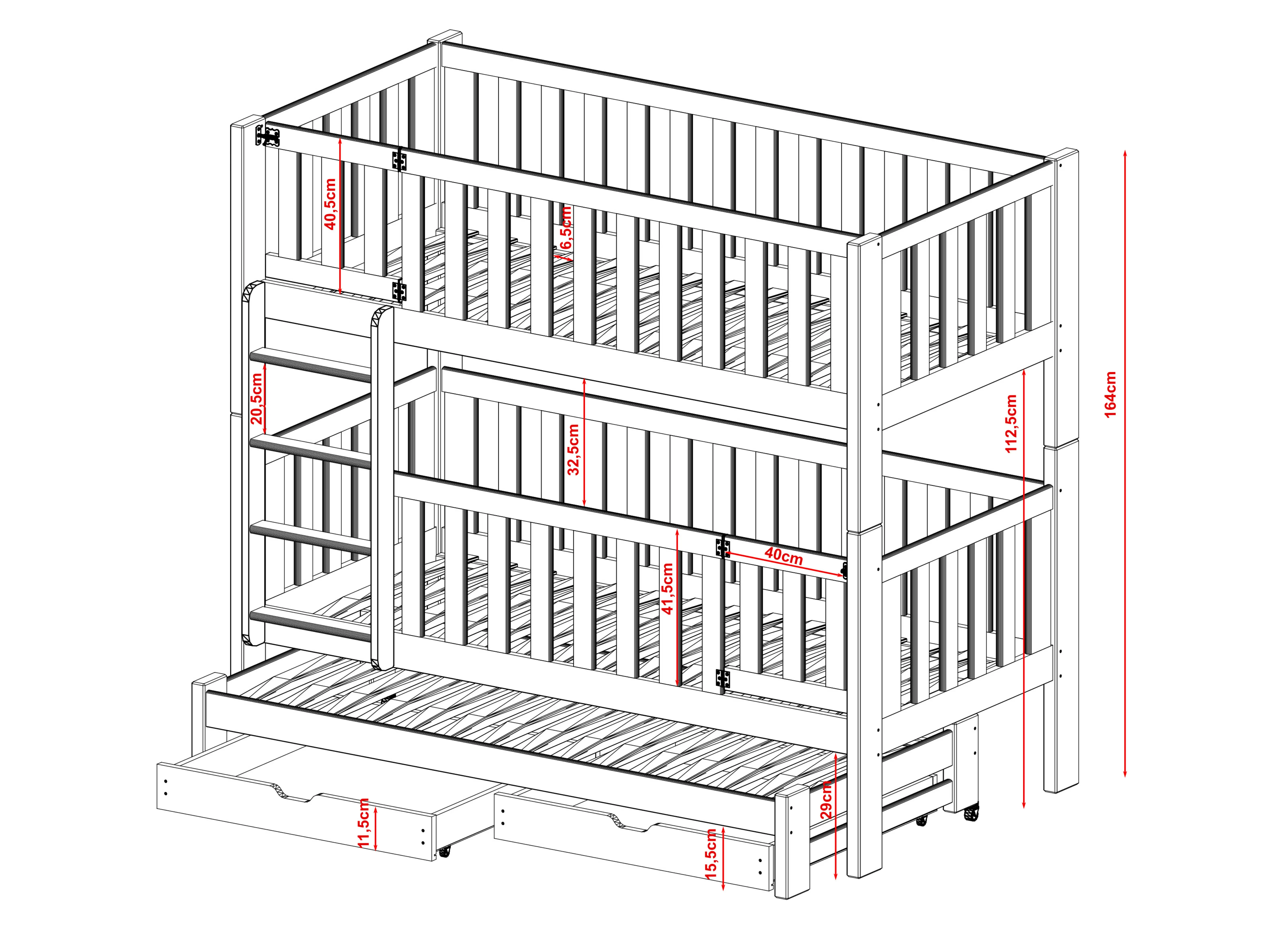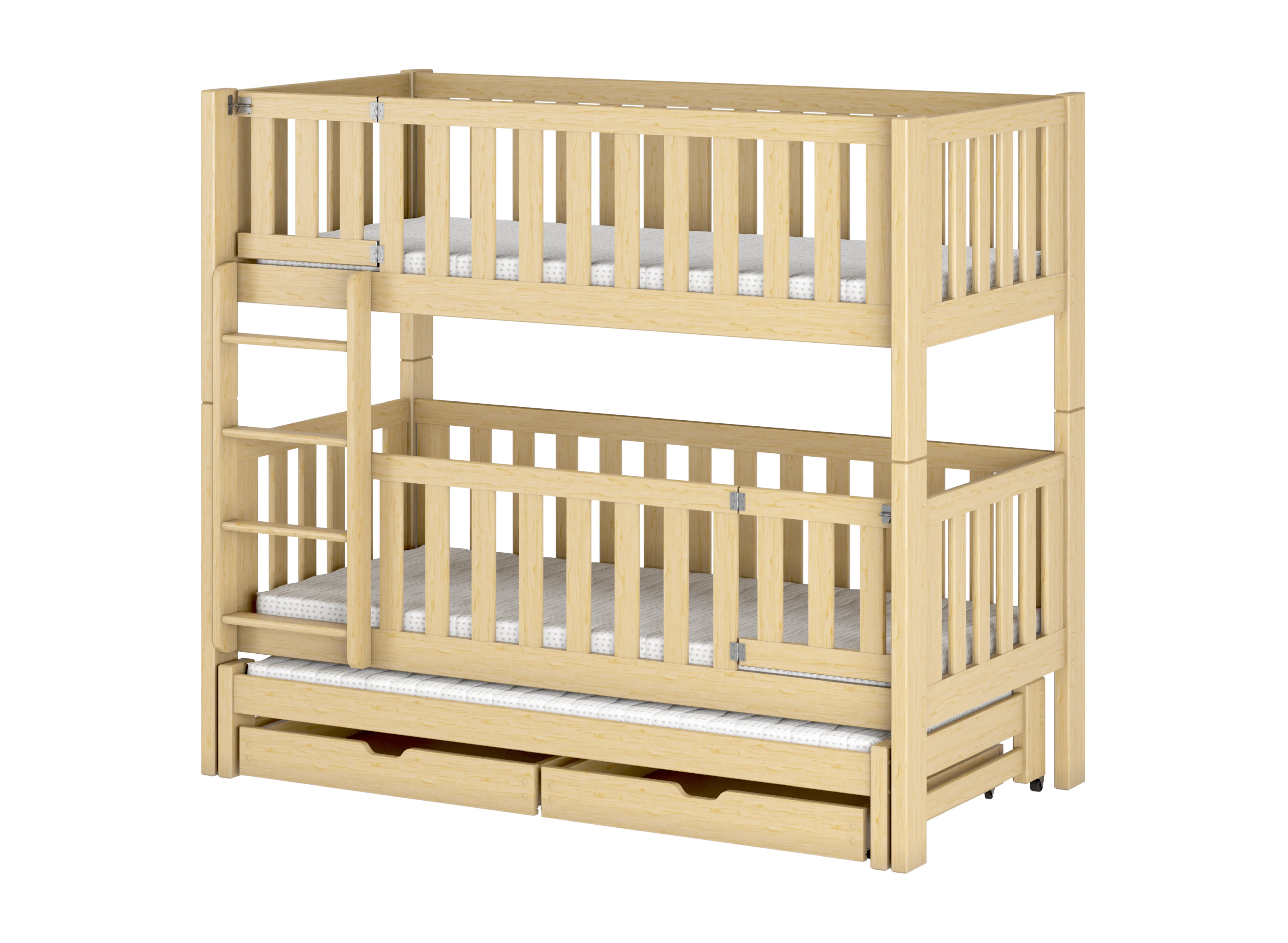AGATHA stapelbed is de perfecte keuze voor ouders die de ruimte in de kinderkamer optimaal willen benutten. Dankzij het uitschuifbare bedplatform en de praktische lades biedt het bed extra opbergruimte, terwijl het tegelijkertijd weinig ruimte inneemt. Vanaf nu is het organiseren van de kinderkamer eenvoudiger dan ooit. Wij geven om de gezondheid van uw kind en de bescherming van onze planeet. Daarom selecteren wij alleen zorgvuldig geselecteerd grenenhout en materialen die voldoen aan de strengste veiligheidsnormen. Alle grondstoffen die gebruikt worden om het AGATHA stapelbed af te werken zijn niet giftig en kindvriendelijk. De geteste lak waarmee het bed is bekleed, voldoet aan alle veiligheidsnormen, zodat u er zeker van kunt zijn dat het de gezondheid van uw kinderen niet schaadt.