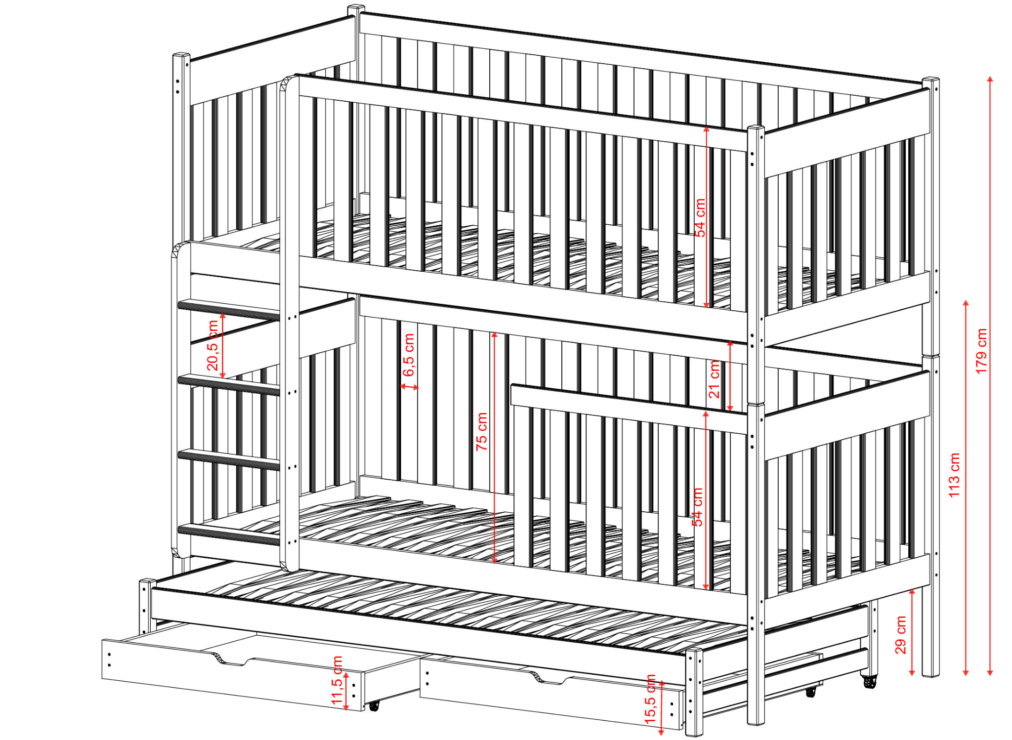 Het EMILKA stapelbed is een bed met veel potentieel, een zeer doordachte constructie en is bedoeld voor broers en zussen die een kamer delen. Het EMILKA stapelbed bestaat uit twee niveaus en een extra uitschuifbaar platform met matras. Overdag is het uit het zicht en neemt het geen ruimte in beslag in de kamer, terwijl het 's nachts uitgeschoven wordt en het derde kind er kan slapen. Hiermee bespaart u veel ruimte in de kinderkamer. Hout wordt nog steeds gezien als het meest duurzame en stabiele materiaal. Het kenmerkt zich door een zeer hoge weerstand tegen mechanische beschadigingen. Het EMILKA stapelbed is gemaakt van grenenhout en kan daardoor jarenlang mee. Bovendien is het oppervlak beschermd met gecertificeerde lakken die veilig zijn voor kinderen. Het EMILKA stapelbed blijft lang mooi.