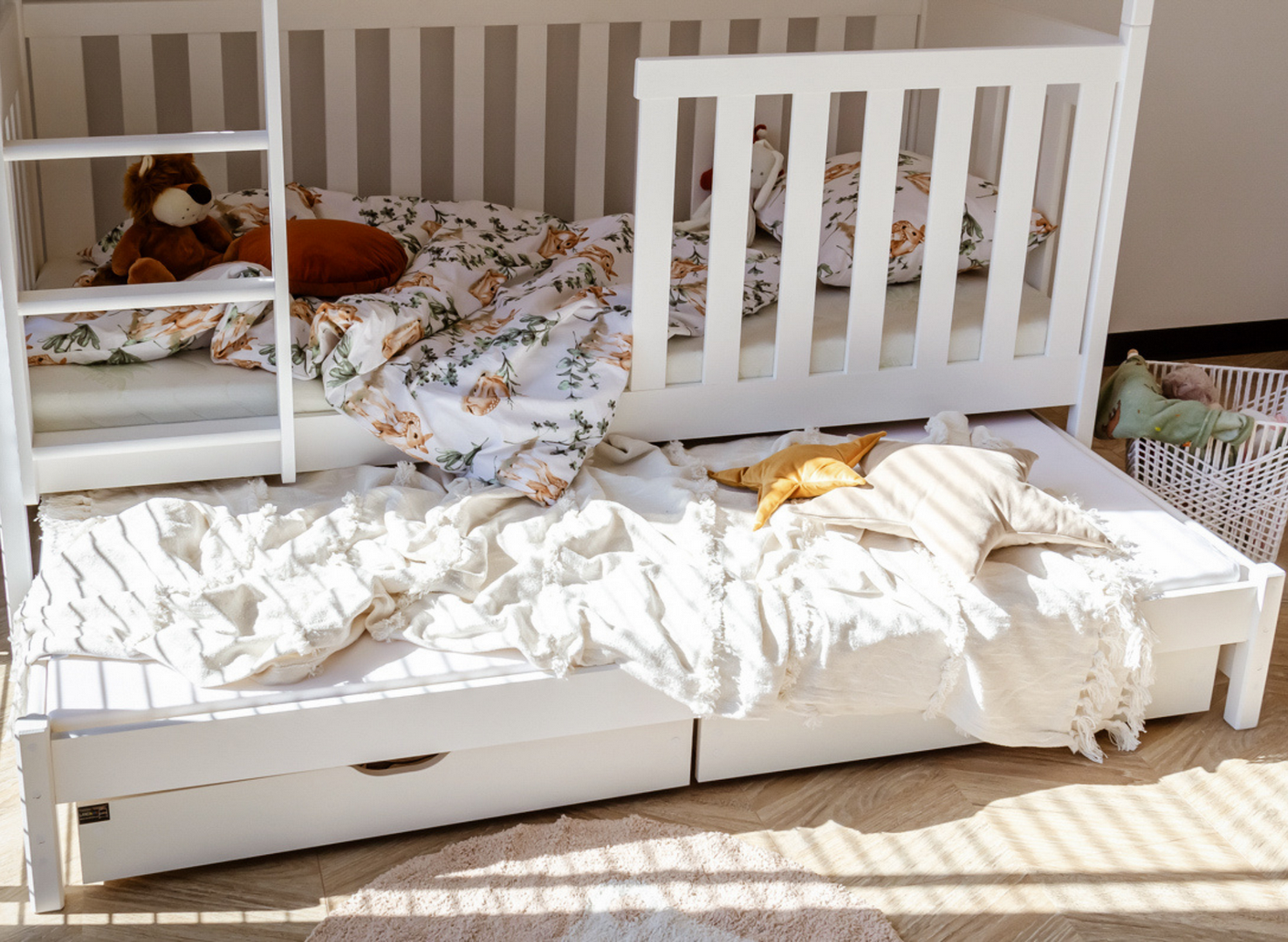 In een kleine kamer, vooral voor broers en zussen, is er altijd een gebrek aan kasten en planken. Het EMILKA stapelbed van Lano Meubels is voorzien van ruime lades onder het uitschuifbare platform. Ze zijn ideaal voor het opbergen van beddengoed, speelgoed of seizoensgebonden kleding. Dit is een voorbeeld van het maximaal benutten van het meubelpotentieel in de kinderkamer.