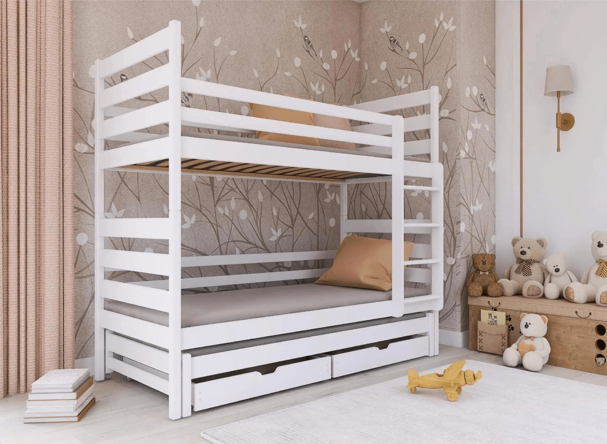 Houten leuningen en comfortabele ladders kenmerken zich door hun veelzijdigheid. Als u na verloop van tijd besluit om het ontwerp te vernieuwen, kunt u dus zelf kiezen aan welke kant u de ingang wilt plaatsen. Het stapelbed TOMI wordt gemonteerd met inbusbouten. Dit betekent dat u het op elk gewenst moment kunt demonteren en verplaatsen. Een andere interessante oplossing zijn de ruime lades die zich onder het onderste matras bevinden. Je kunt er beddengoed of speelgoed in opbergen, zodat de kinderkamer altijd opgeruimd is.