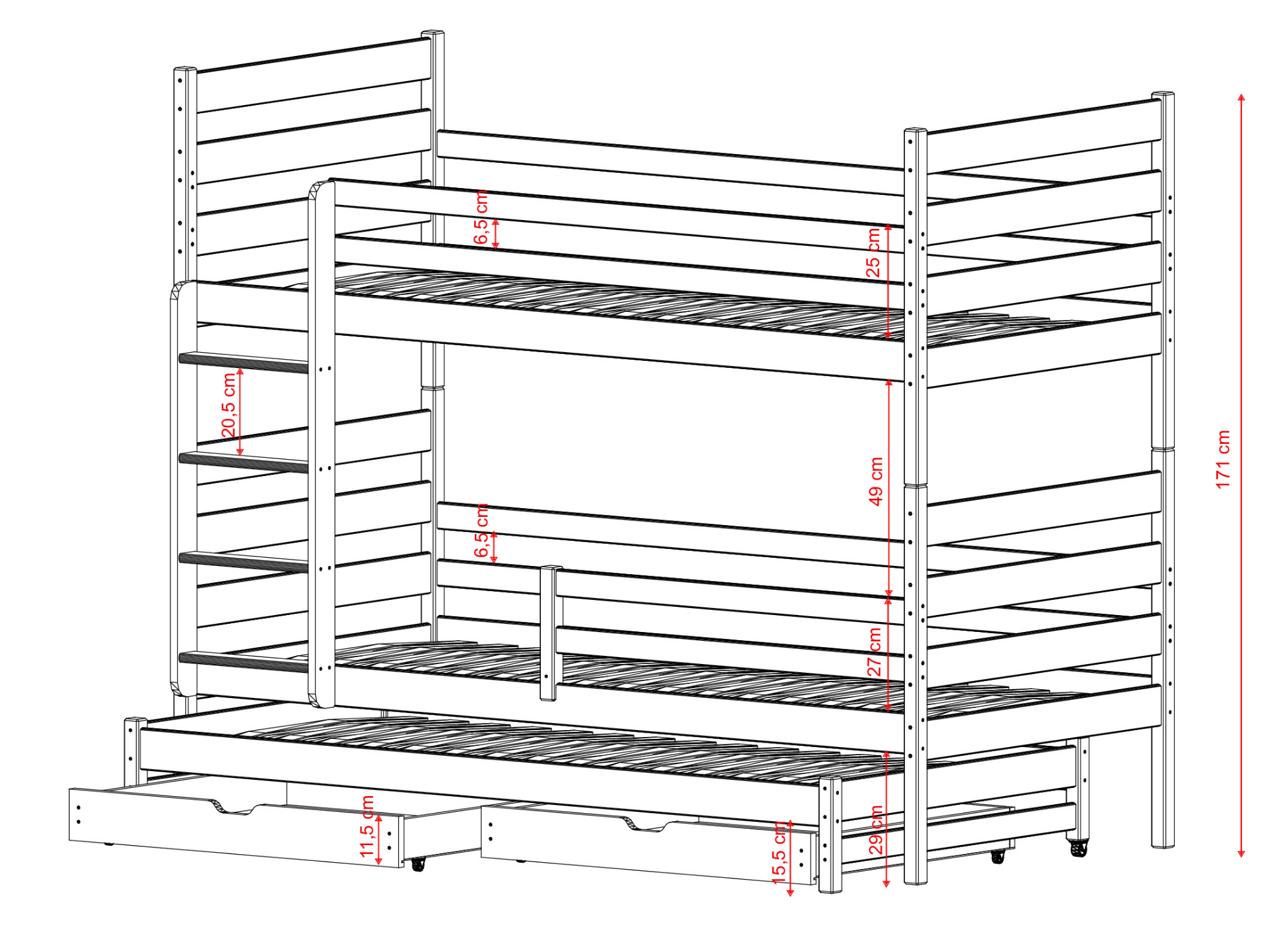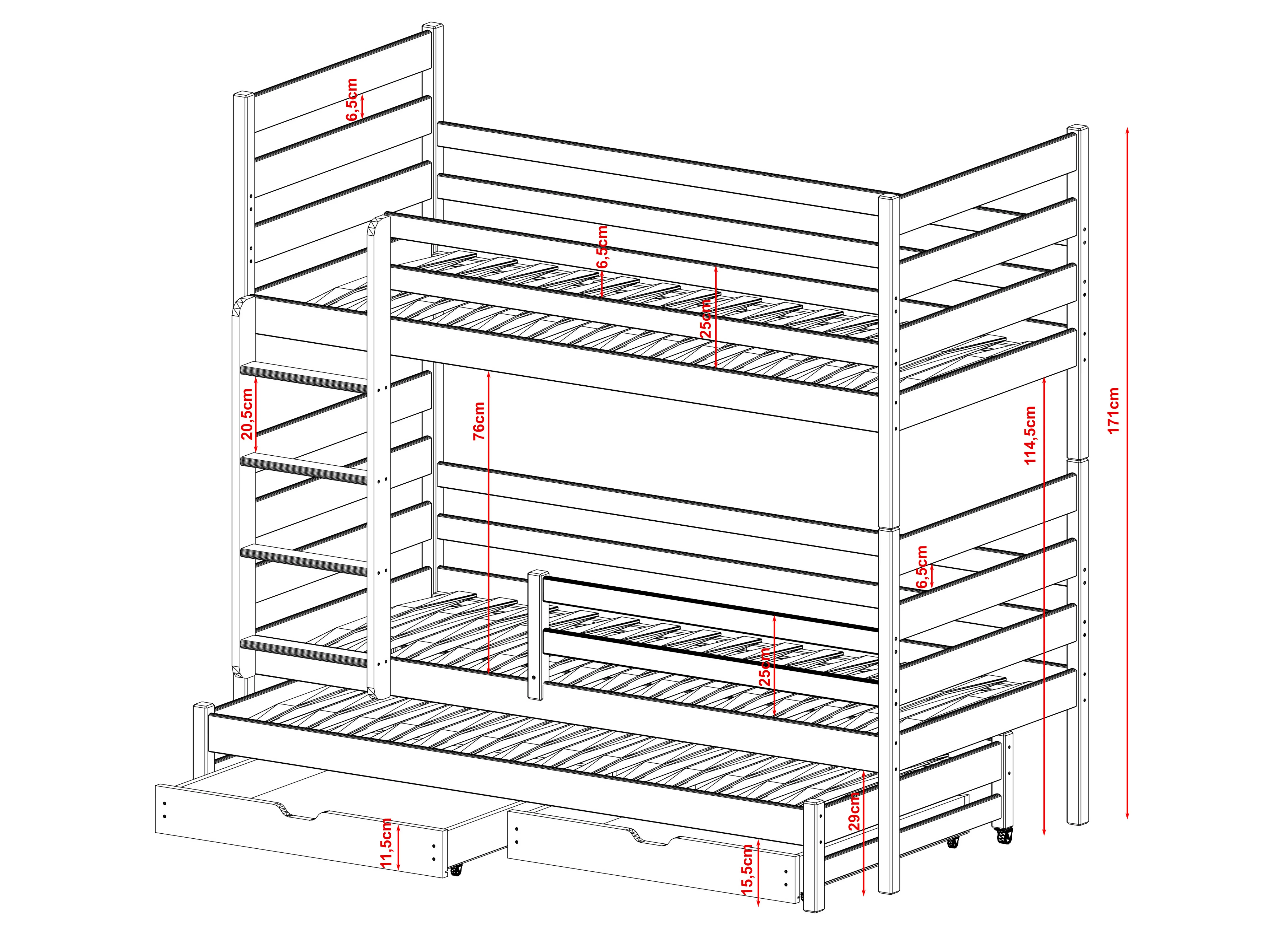 Bij Lano Meubels hechten we veel waarde aan de veiligheid van uw kind. Daarom worden al onze kinderbedden vervaardigd volgens de hoogste normen. Het frame van het TOMI stapelbed is gemaakt van grenenhout en geverfd met verf op waterbasis, die duurzaam is en voldoet aan alle gezondheidsnormen. Bovendien past het universele ontwerp van de meubels zich gemakkelijk aan het interieur aan en kunt u de kamer van uw kind gezellig maken. Het TOMI stapelbed kan een interessante optie zijn voor zowel tweelingen als broers en zussen van dezelfde leeftijd. U kunt het stapelbed TOMI van Lano Meubels aanpassen aan uw individuele wensen. Het bed heeft zelfs 3 slaapplaatsen, zodat u de juiste boven- en ondermatras kunt kiezen, evenals een matras voor het uitschuifbare onderstel. Als uw kinderen het TOMI stapelbed niet meer willen gebruiken, kunt u het altijd in twee aparte bedden verdelen.