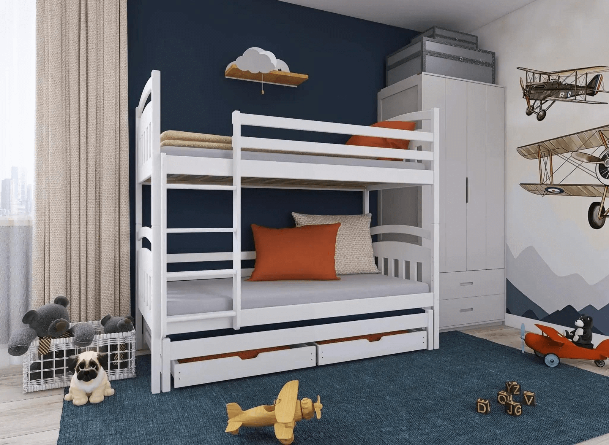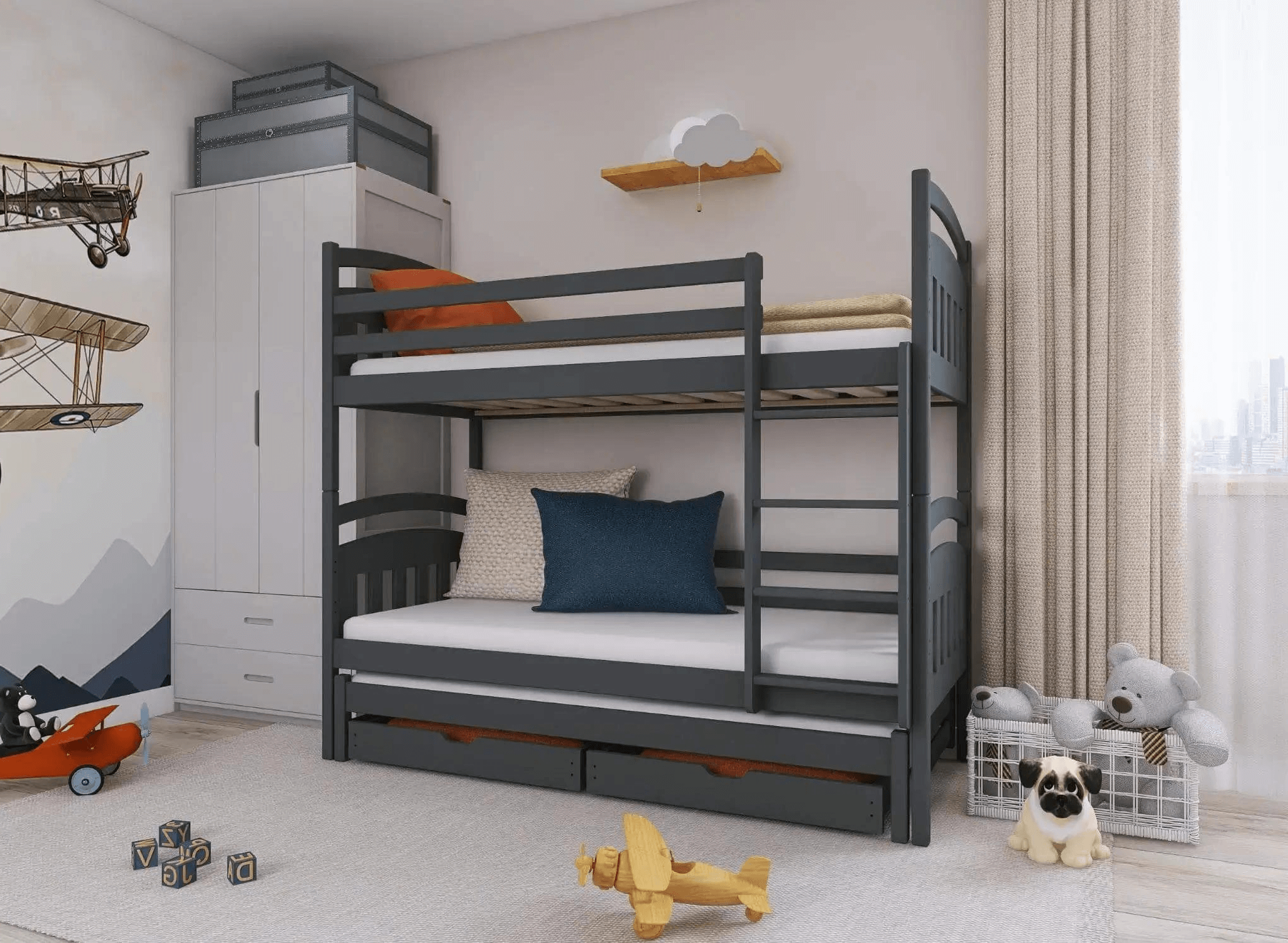 Het vinden van een functioneel meubelstuk waarop twee of zelfs drie kinderen gemakkelijk kunnen slapen, is een echte uitdaging. Toch is dit mogelijk, ook al is de beperkte ruimte in de kinderkamer een beperking. Ontdek meer over de voordelen van het drieverdiepingsstapelbed ALAN! Elk kind is anders en heeft individuele behoeften. Om de droom van elk kind te vervullen, bieden wij de mogelijkheid om dit kinderkamermeubilair naar uw persoonlijke smaak te personaliseren. Bovendien is het functionele ALAN stapelbed gemakkelijk in kleine ruimtes te plaatsen.