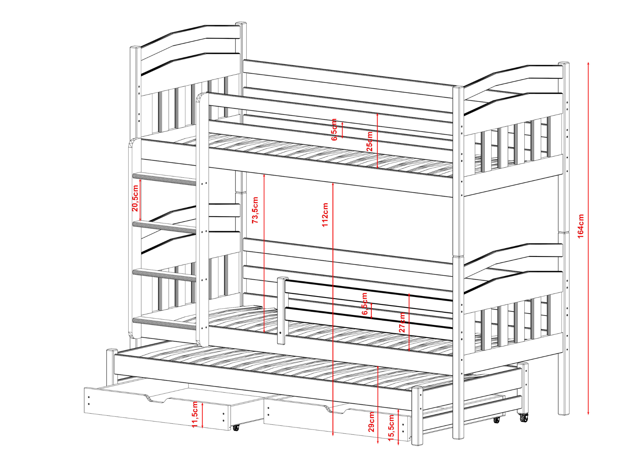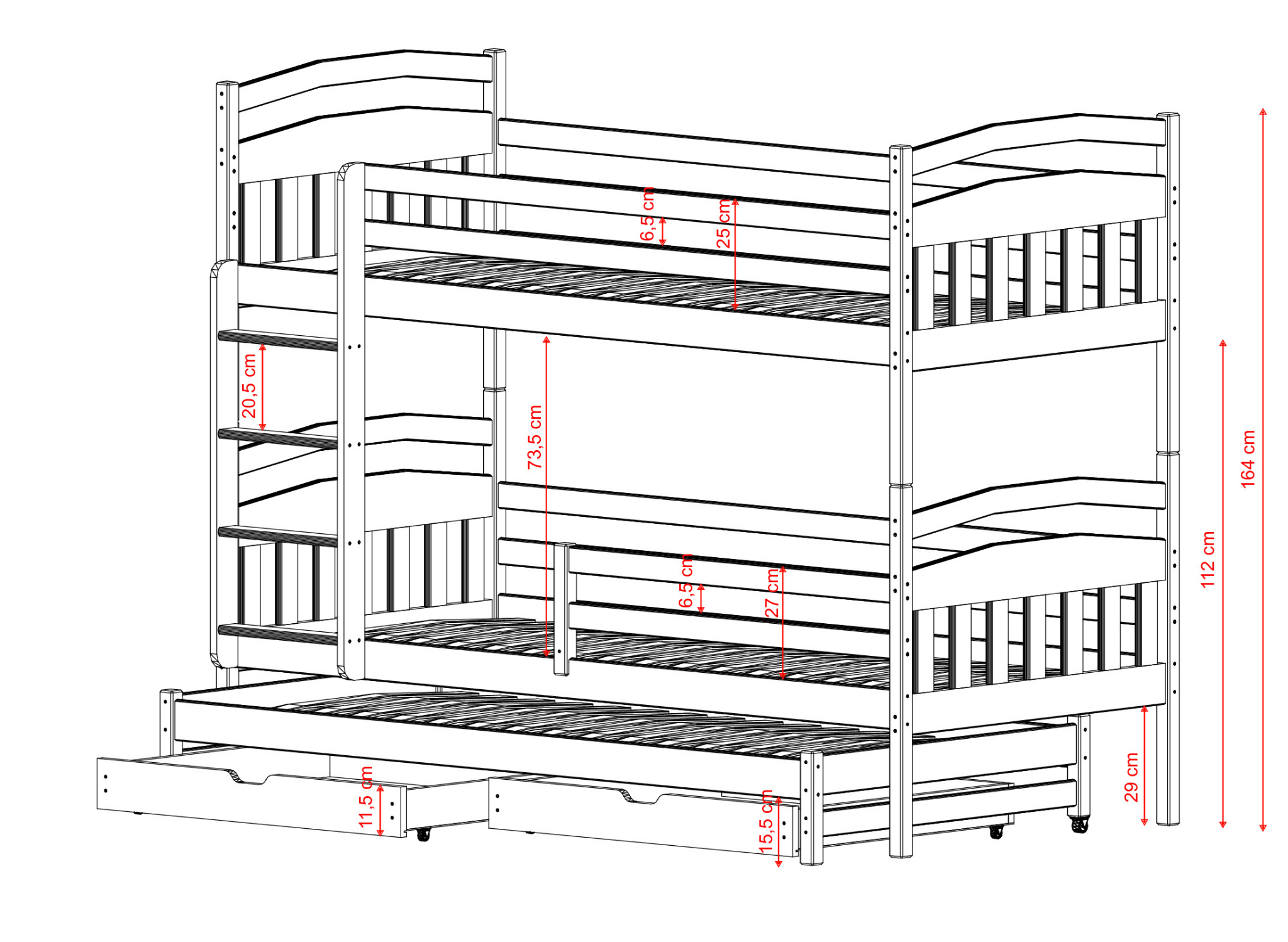 Het stapelbed ALAN met drie verdiepingen is ideaal om comfortabele slaapomstandigheden te creëren voor drie broers en zussen. Drie slaapgedeeltes met vrijwel identieke afmetingen bieden elk kind optimaal comfort 's nachts, ongeacht op welke verdieping het slaapt. De derde matras kan ook een extra optie zijn voor gasten of een plek waar de kinderen kunnen spelen, zodat er geen speelgoed in het bed achterblijft.