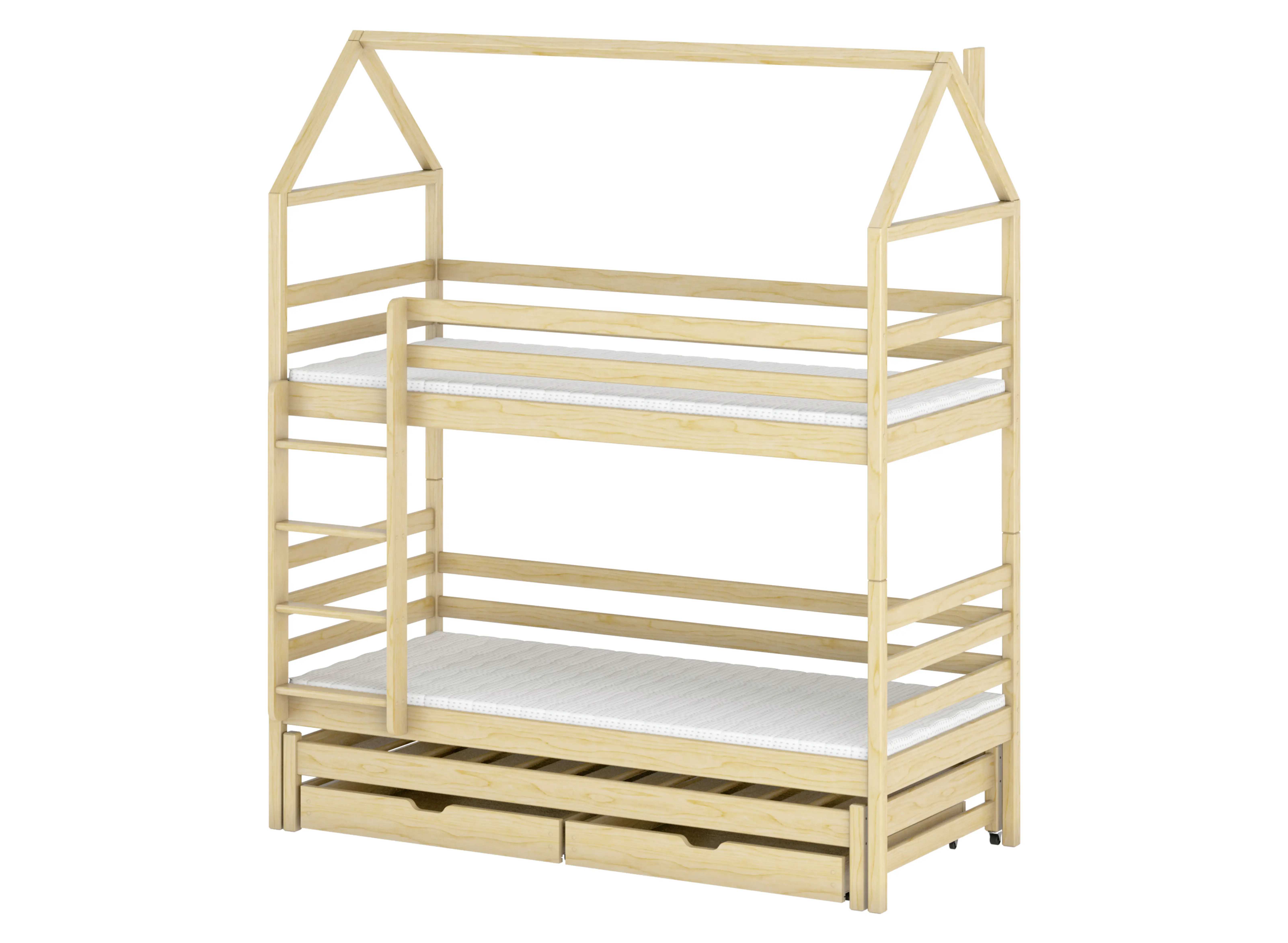 De stevige frameconstructie van het DALIA huis stapelbed hebben we volledig gemaakt van stofbestendig grenenhout, en het matrasframe is gemaakt van flexibele FLEX-type berkenhouten latten. Een onmisbaar veiligheidselement van het meubilair zijn goed geplaatste, hoge leuningen (inclusief de bovenste leuning) en een ladder met comfortabele sporten. De montage gebeurt met inbusbouten, waardoor de constructie duurzaam is en vele jaren meegaat.
