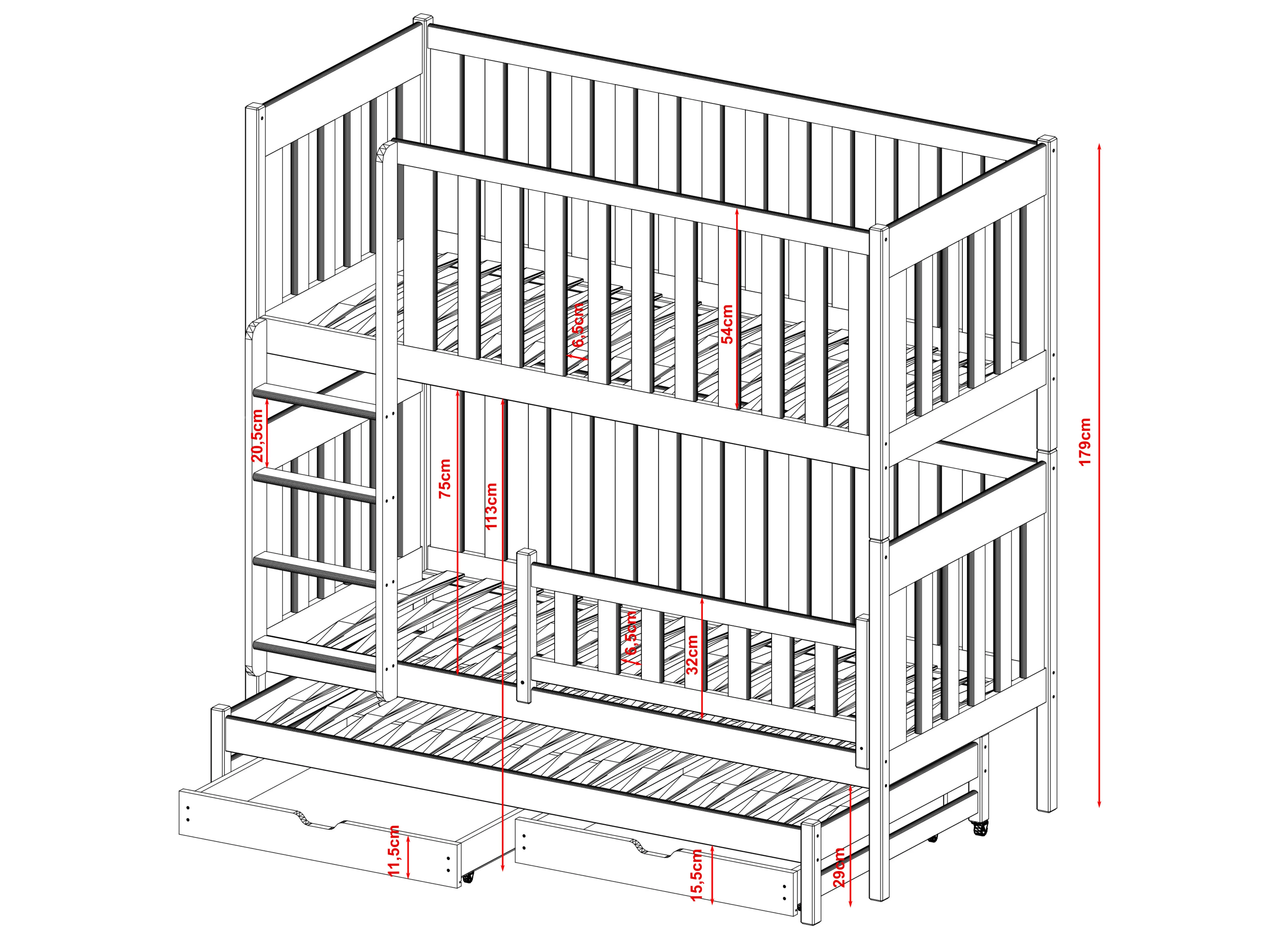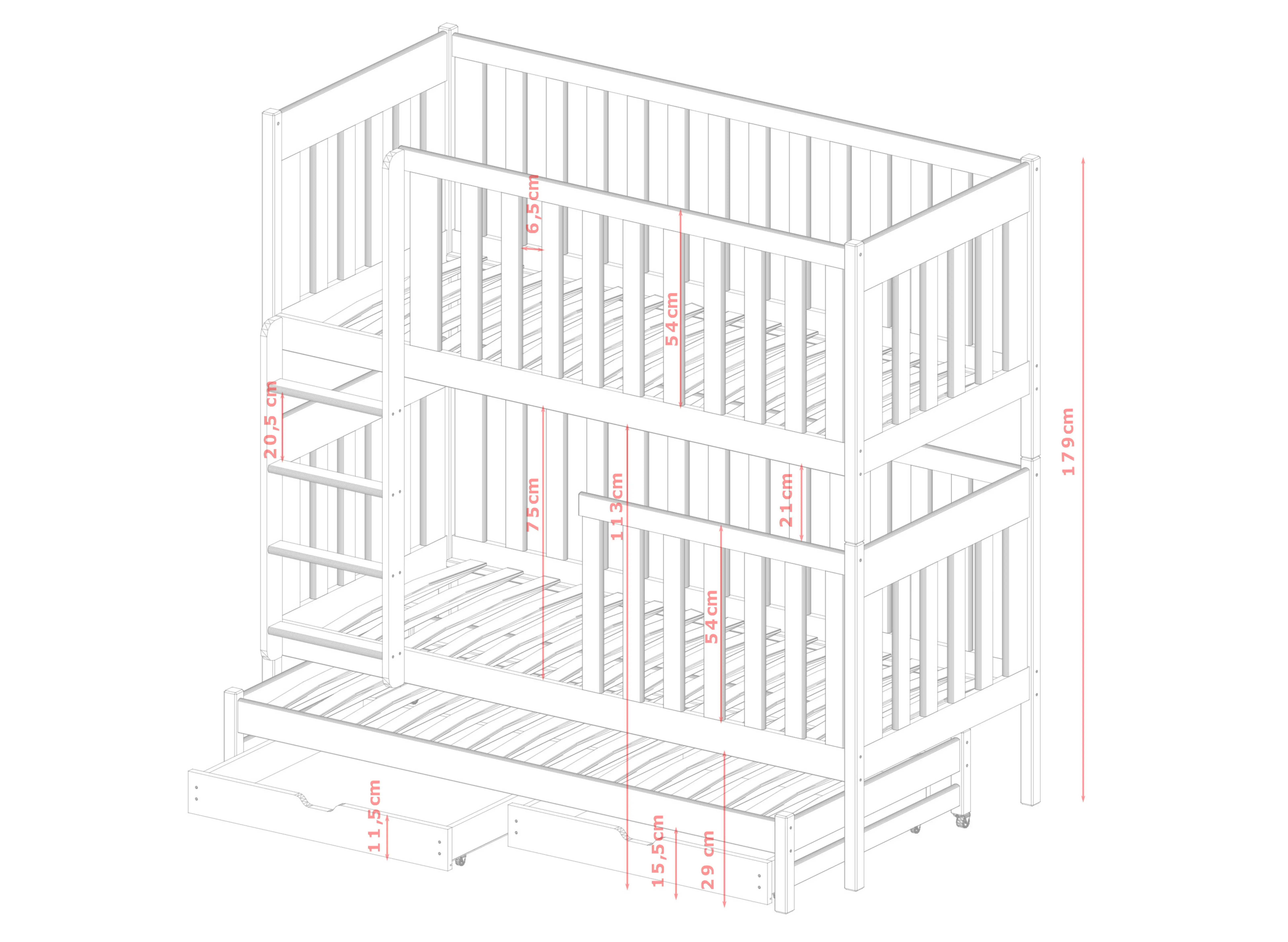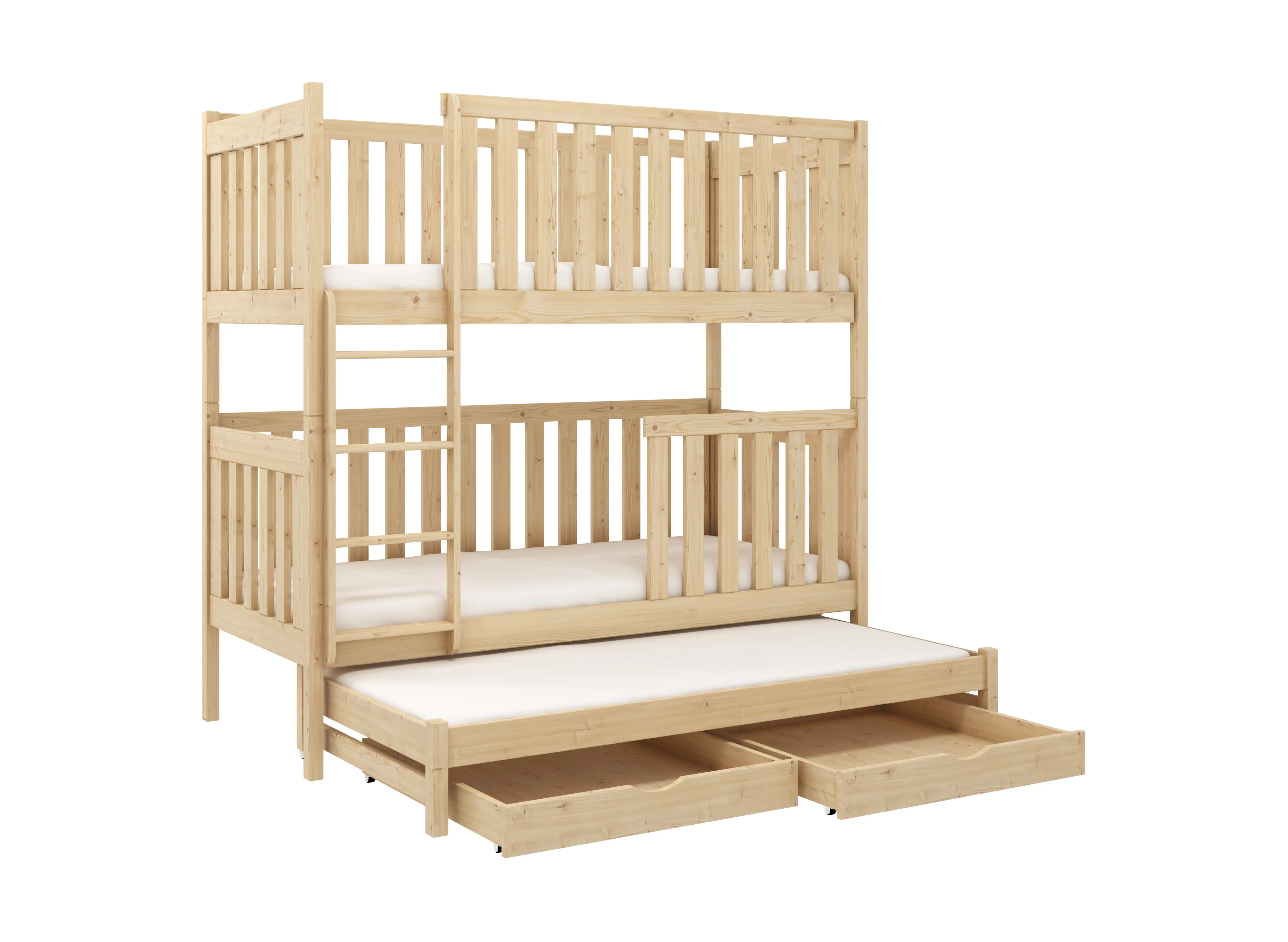Het EMILKA stapelbed is een bed met veel potentieel, een zeer doordachte constructie en is bedoeld voor broers en zussen die een kamer delen. Het EMILKA stapelbed bestaat uit twee niveaus en een extra uitschuifbaar platform met matras. Overdag is het uit het zicht en neemt het geen ruimte in beslag in de kamer, terwijl het 's nachts uitgeschoven wordt en het derde kind er kan slapen. Hiermee bespaart u veel ruimte in de kinderkamer. Hout wordt nog steeds gezien als het meest duurzame en stabiele materiaal. Het kenmerkt zich door een zeer hoge weerstand tegen mechanische beschadigingen. Het EMILKA stapelbed is gemaakt van grenenhout en kan daardoor jarenlang mee. Bovendien is het oppervlak beschermd met gecertificeerde lakken die veilig zijn voor kinderen. Het EMILKA stapelbed blijft lang mooi.