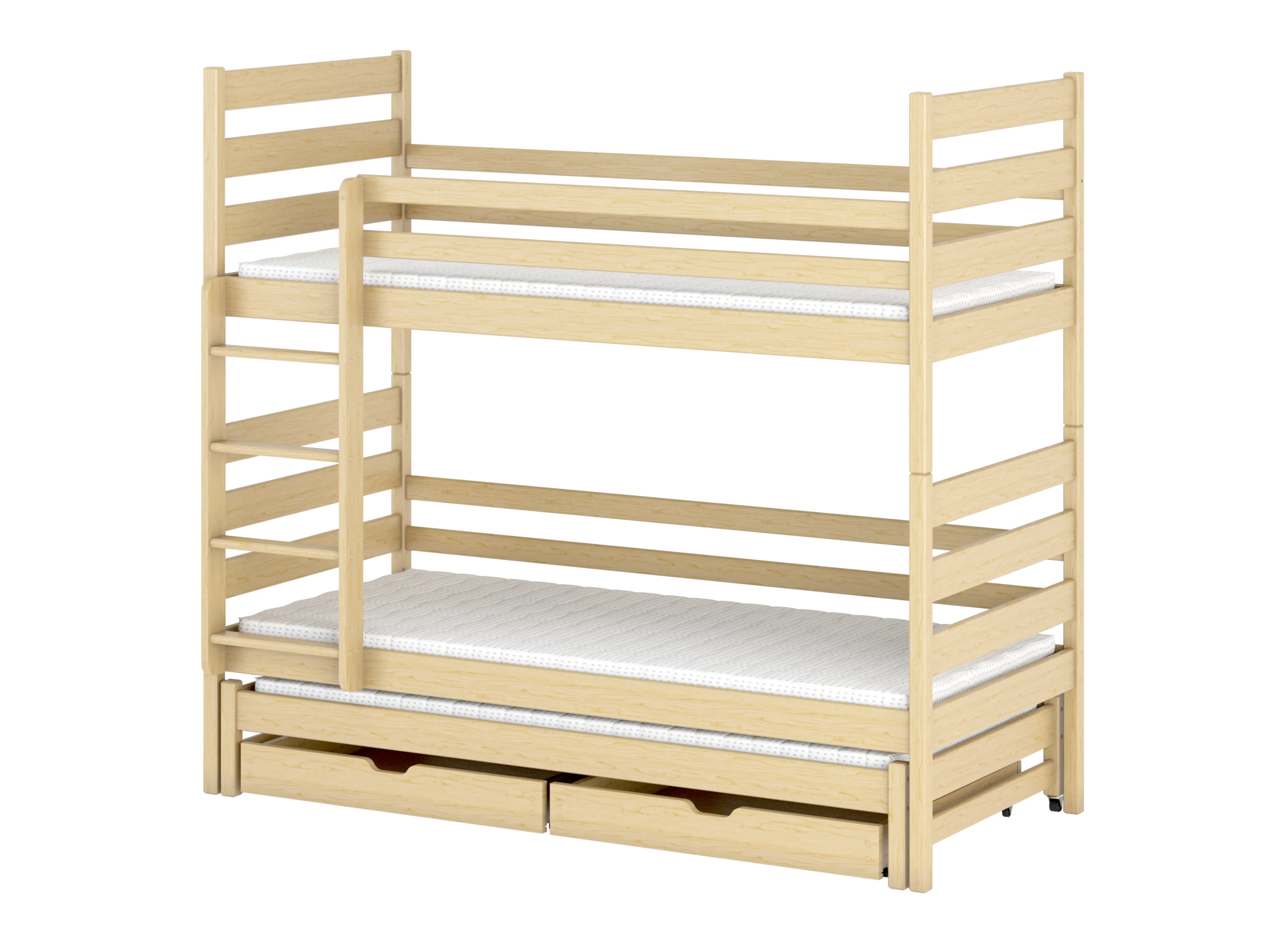 Houten leuningen en comfortabele ladders kenmerken zich door hun veelzijdigheid. Als u na verloop van tijd besluit om het ontwerp te vernieuwen, kunt u dus zelf kiezen aan welke kant u de ingang wilt plaatsen. Het stapelbed TOMI wordt gemonteerd met inbusbouten. Dit betekent dat u het op elk gewenst moment kunt demonteren en verplaatsen. Een andere interessante oplossing zijn de ruime lades die zich onder het onderste matras bevinden. Je kunt er beddengoed of speelgoed in opbergen, zodat de kinderkamer altijd opgeruimd is.
