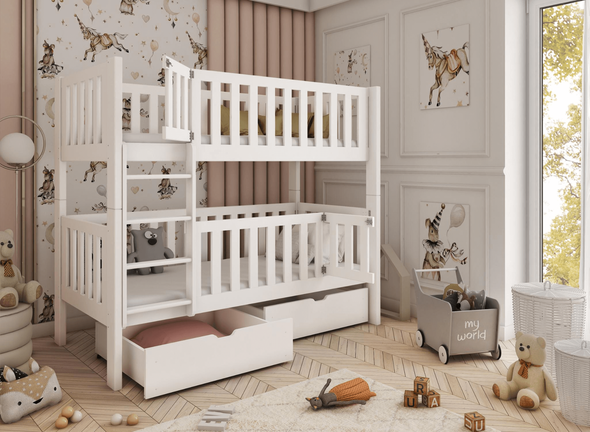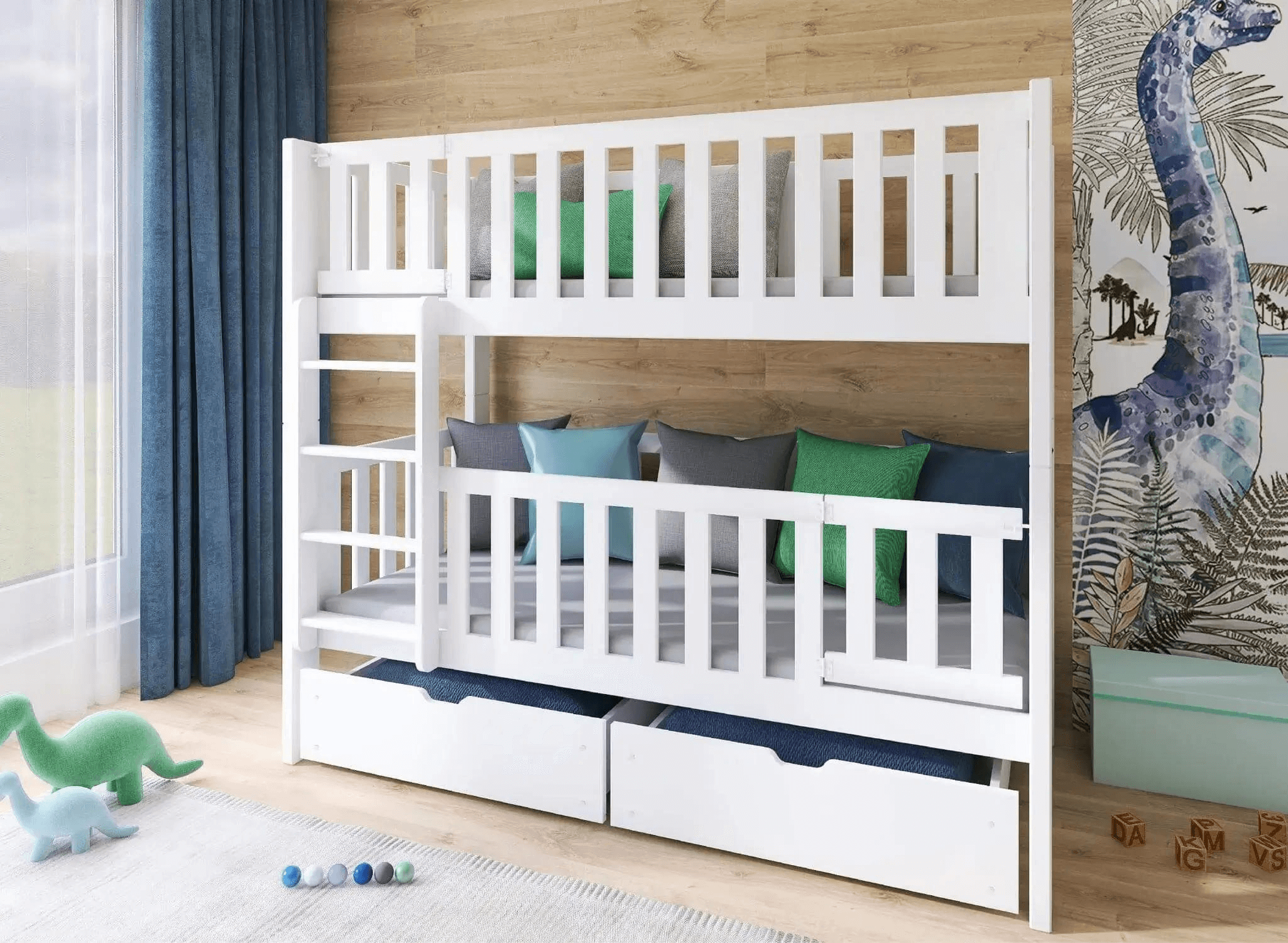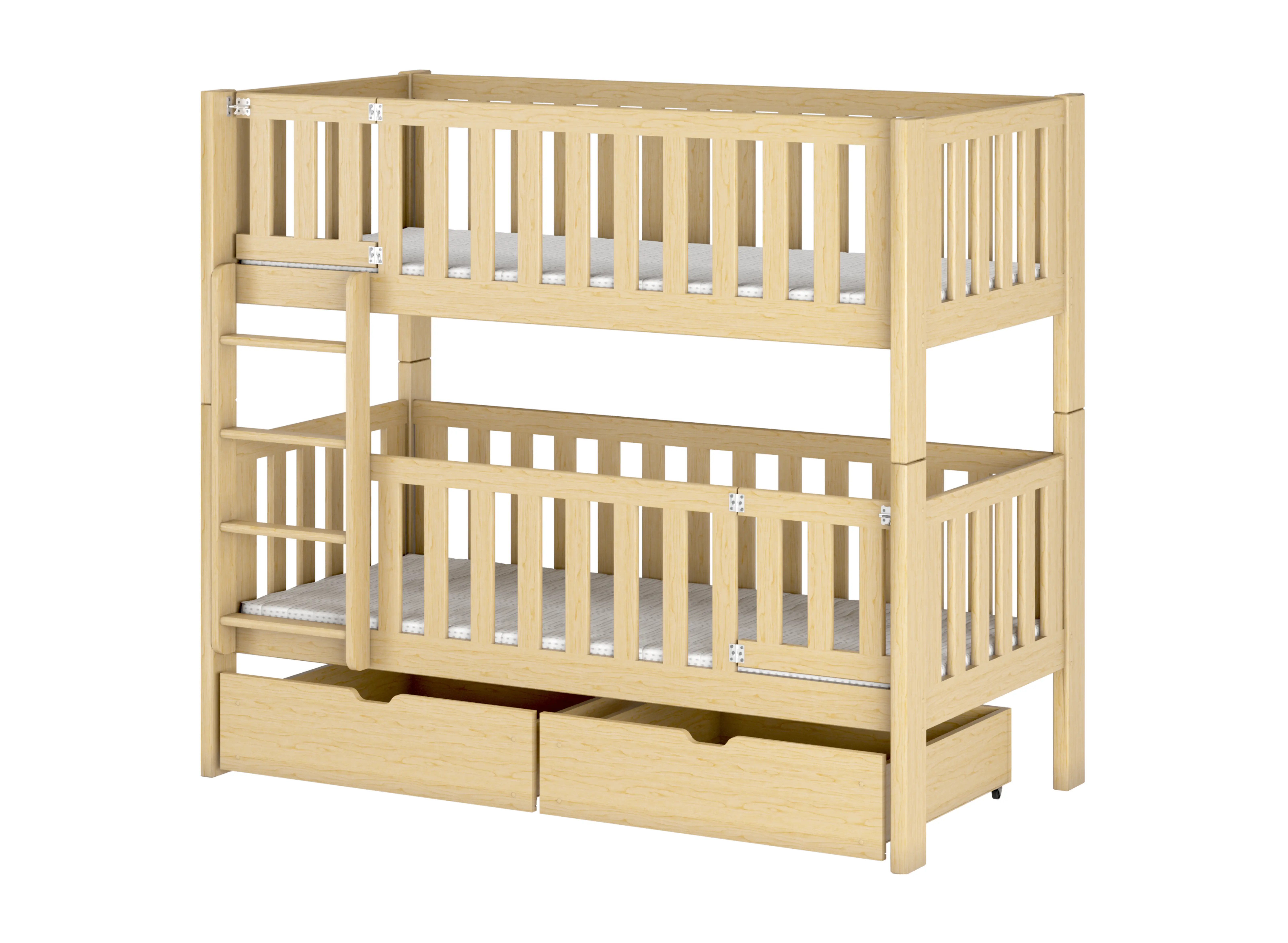 Het stapelbed KSAWERY van Lano Meubels is gemaakt van grenenhout. De constructie is daardoor robuust, de afzonderlijke elementen vervormen niet onder druk en het oppervlak behoudt zijn esthetische uitstraling dankzij de behandeling met gecertificeerde lakken. Optioneel kan het stapelbed KSAWERY worden uitgerust met twee diepe uittrekbare laden. Dit is een goede oplossing voor kleine ruimtes wanneer u extra opbergruimte nodig hebt voor speelgoed, kleding of gewoon beddengoed. De lades werken onafhankelijk van elkaar, dus het is niet nodig om ze tegelijkertijd uit te trekken om toegang te krijgen tot de inhoud van een van de laden.