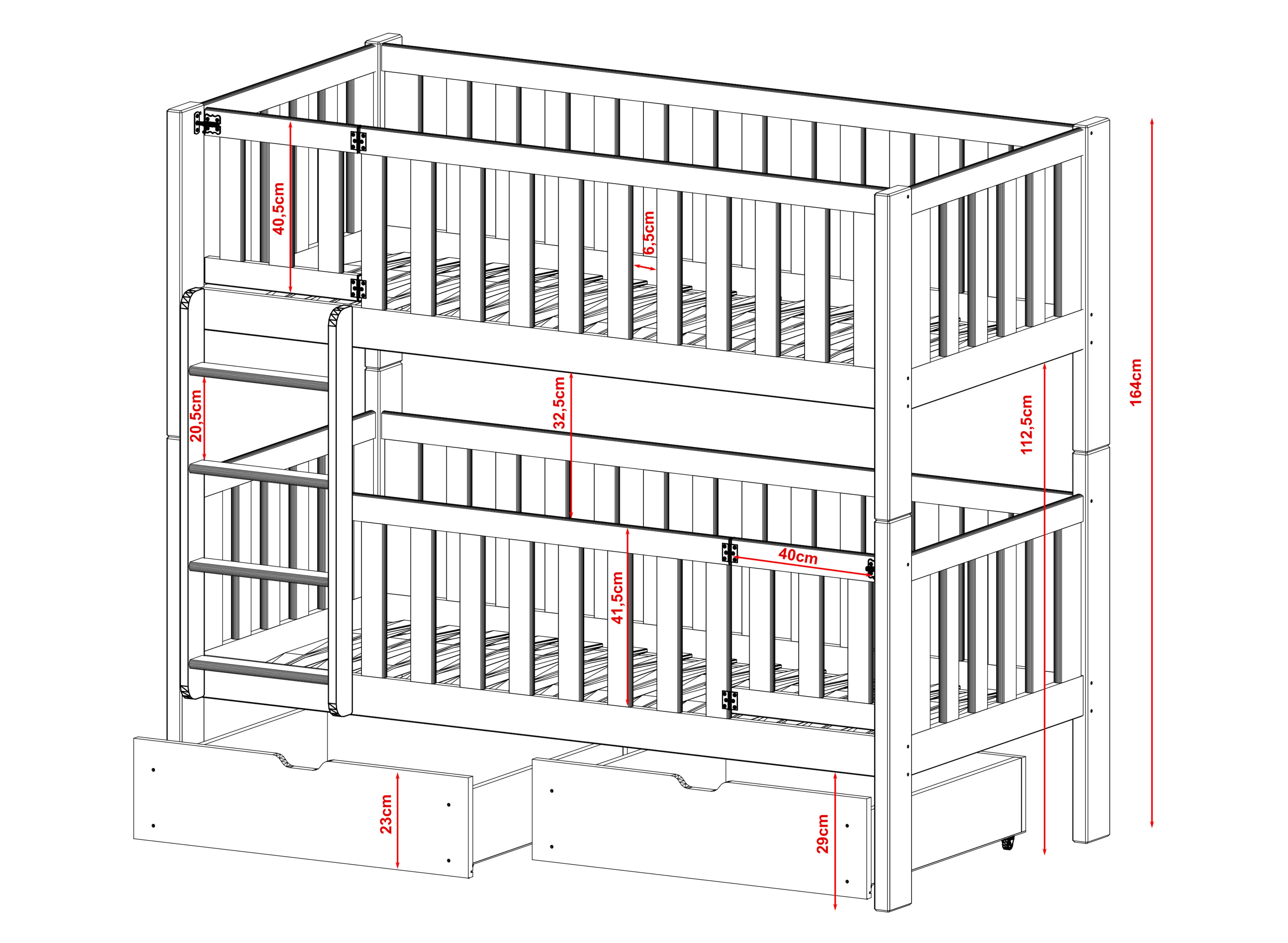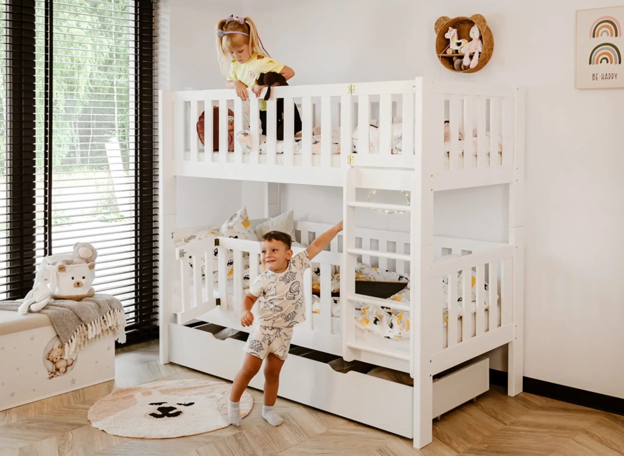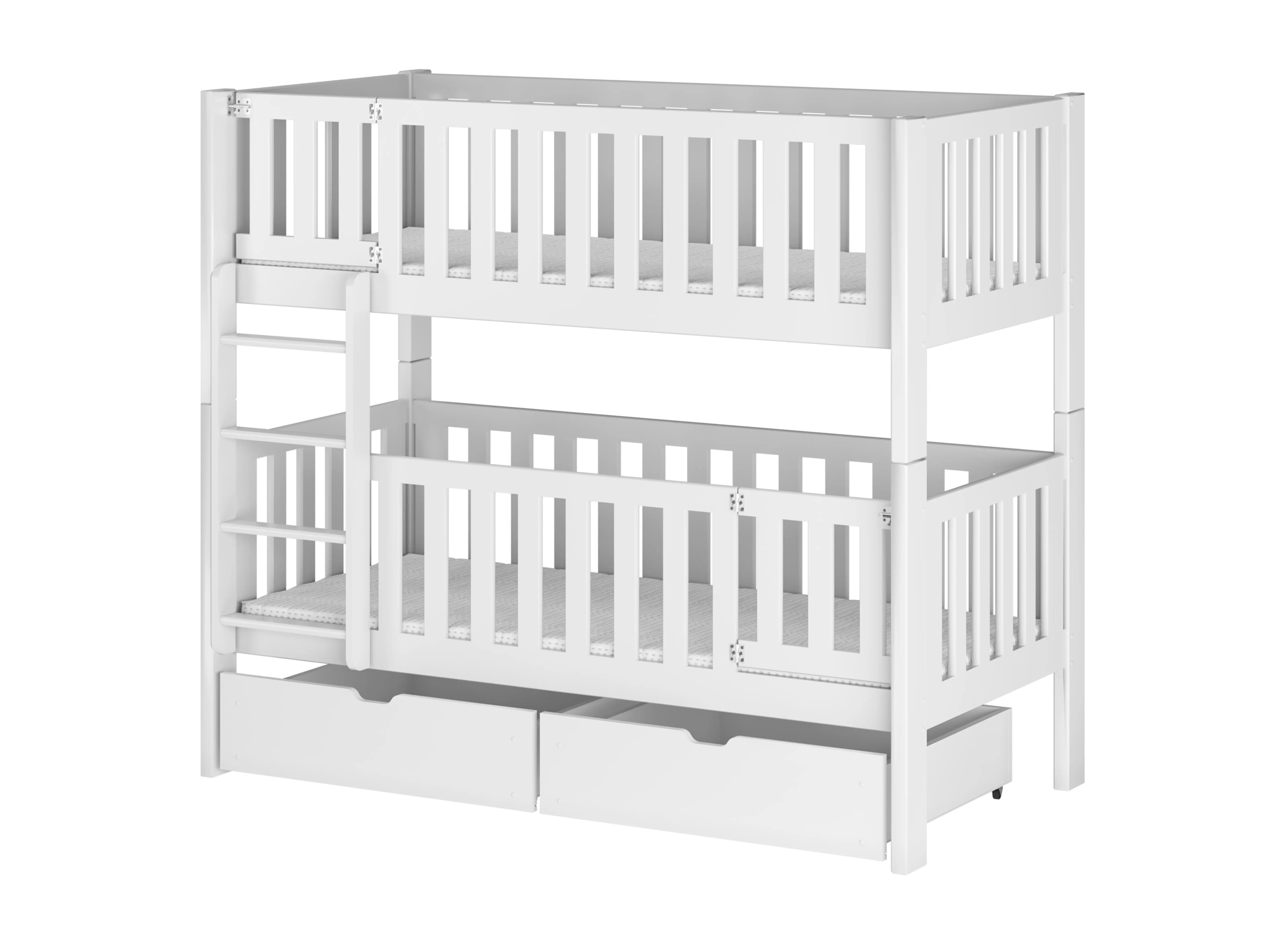 Het stapelbed KSAWERY van Lano Meubels is gemaakt van grenenhout. De constructie is daardoor robuust, de afzonderlijke elementen vervormen niet onder druk en het oppervlak behoudt zijn esthetische uitstraling dankzij de behandeling met gecertificeerde lakken. Optioneel kan het stapelbed KSAWERY worden uitgerust met twee diepe uittrekbare laden. Dit is een goede oplossing voor kleine ruimtes wanneer u extra opbergruimte nodig hebt voor speelgoed, kleding of gewoon beddengoed. De lades werken onafhankelijk van elkaar, dus het is niet nodig om ze tegelijkertijd uit te trekken om toegang te krijgen tot de inhoud van een van de laden.