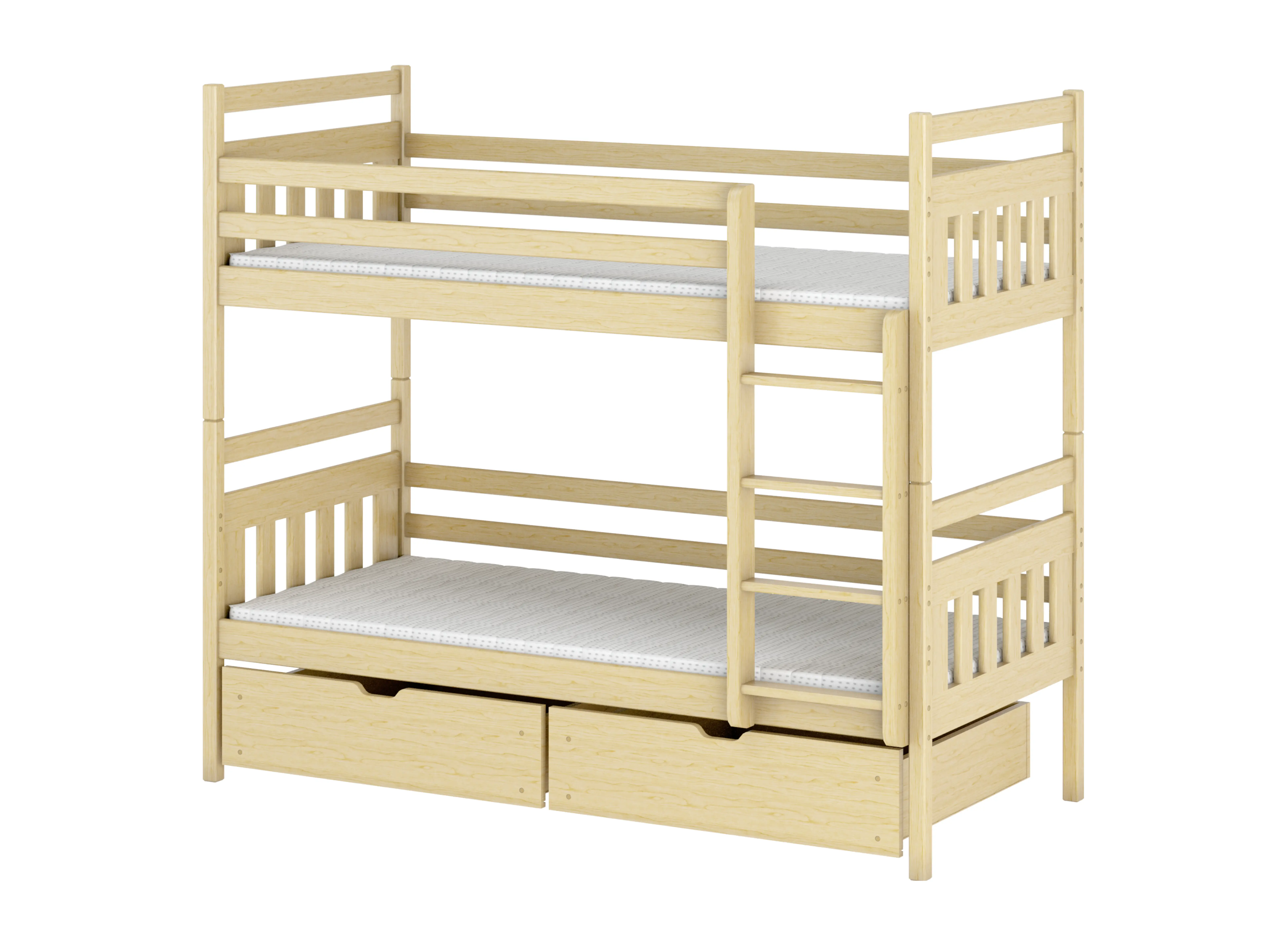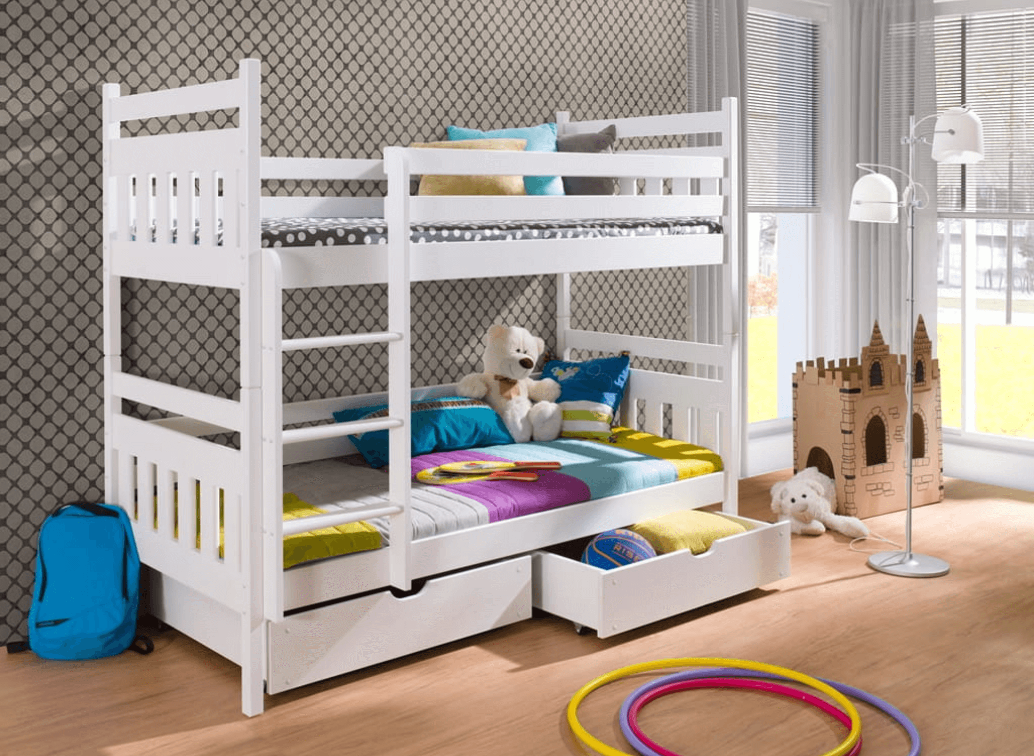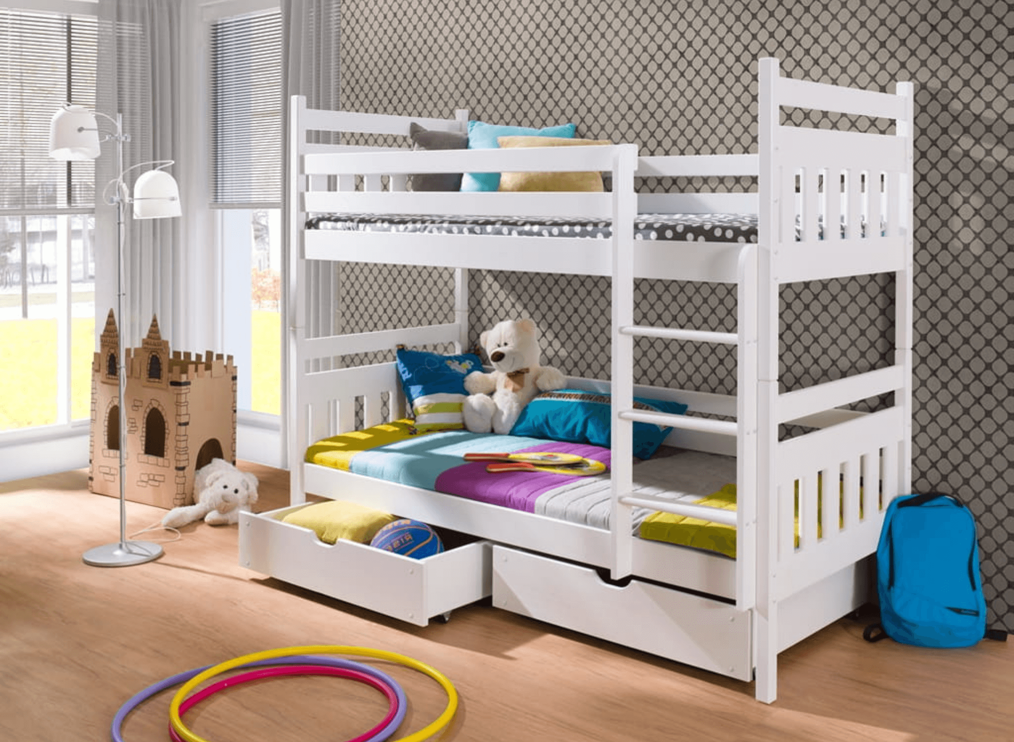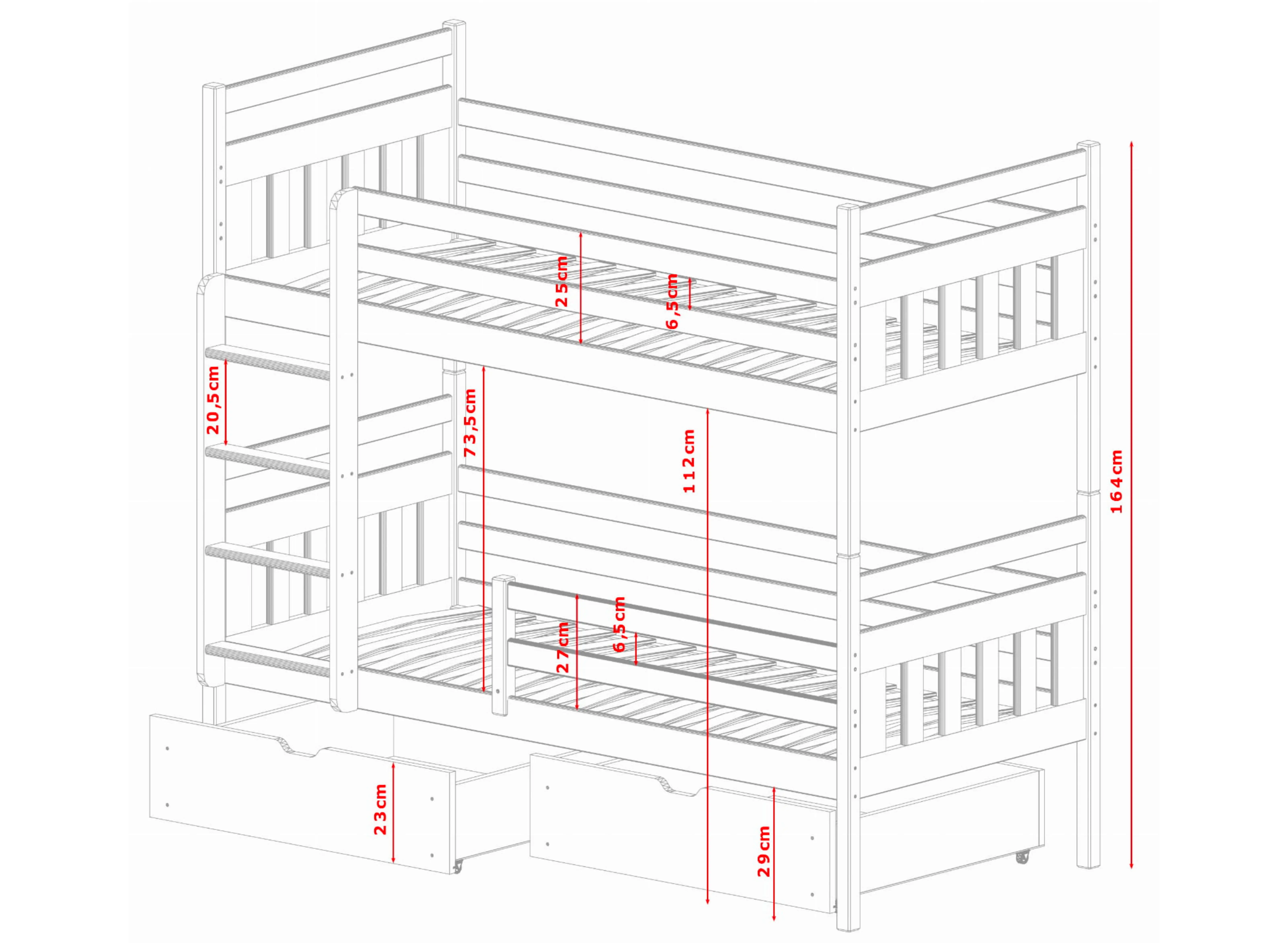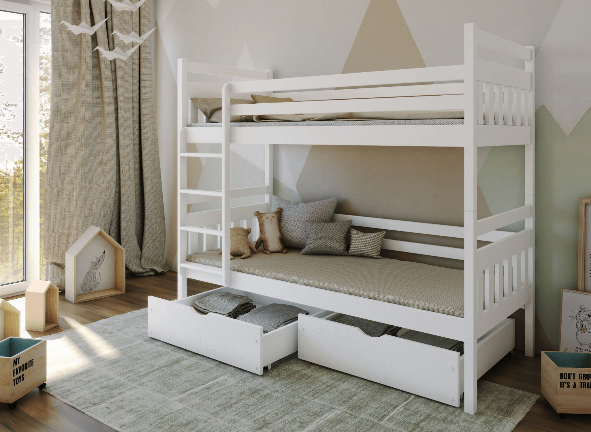 Het stapelbed ADAŚ voldoet perfect aan deze eisen. Het is gemaakt van 100% grenenhout en is voorzien van veilige leuningen en een comfortabele ladder. Het ADAŚ stapelbed gaat lang mee. Hout is ook een geweldig materiaal voor mensen met een allergie: het heeft antistatische eigenschappen (het trekt geen stof aan). De houten planken waarvan dit meubelstuk is gemaakt, voelen prettig aan voor kleine handjes. Ze zorgen voor gezelligheid en creëren een rustgevende sfeer waarin elke peuter zich op zijn gemak voelt. De houten elementen zijn geverfd met kleuren die niet schadelijk zijn voor de gezondheid. Het ADAŚ stapelbed met de mogelijkheid om lades toe te voegen garandeert niet alleen een comfortabele en rustige slaap, maar biedt ook mooie esthetische waarden. De praktische lades onder het bed kunnen dienen als schatkamer of voor het opbergen van huishoudtextiel en andere kleine spullen. De praktische houten leuningen verdienen aandacht. Ze voorkomen dat het kind eruit valt en geven ouders een gerust gevoel. De houten ladder heeft een passende vorm en biedt gemakkelijke toegang tot de bovenverdieping.
