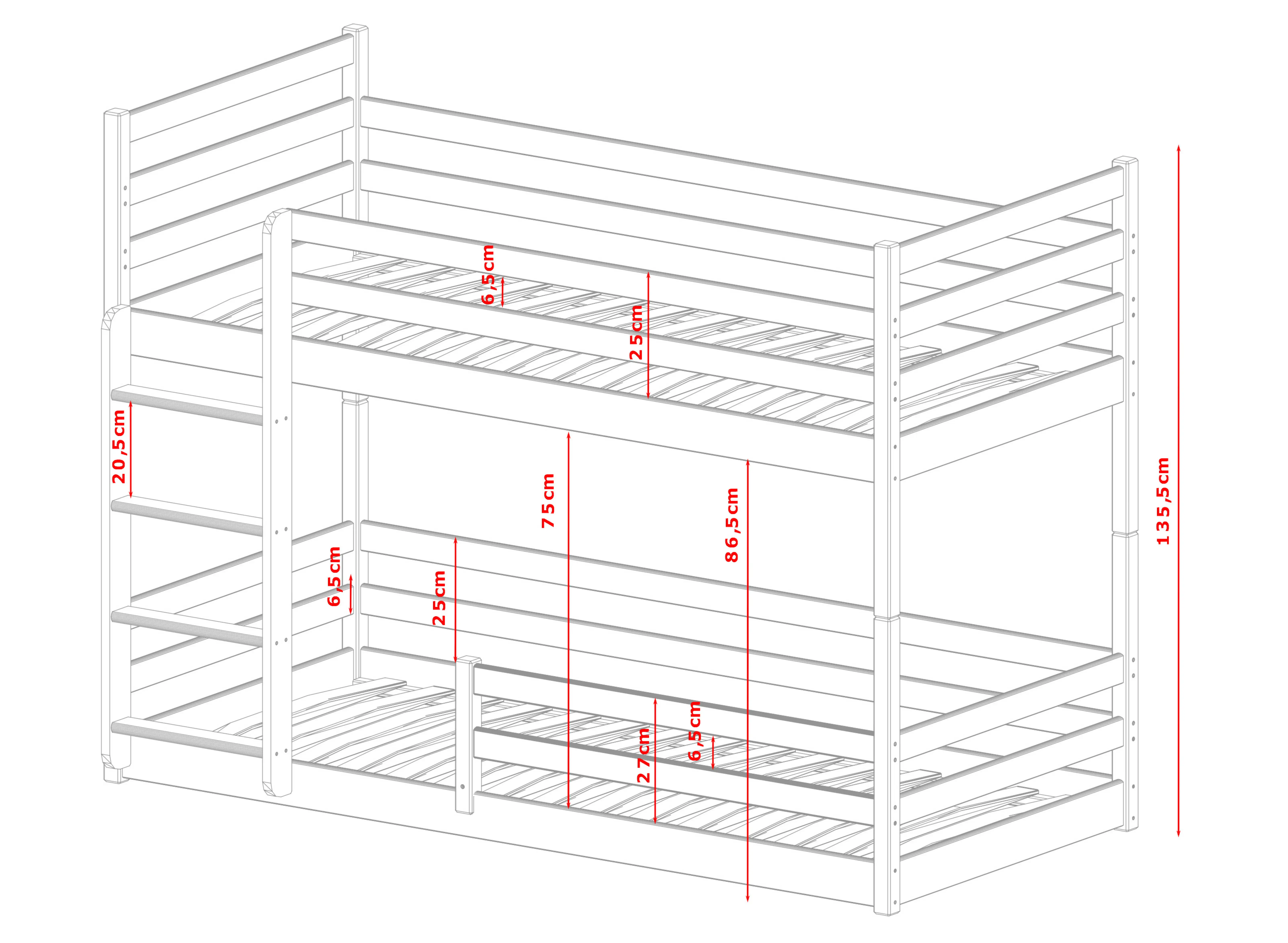 Het mini stapelbed is een meubelstuk dat gebaseerd is op de ervaring en observatie van de kleintjes. Hierdoor konden we een oplossing creëren die uitzonderlijk comfortabel en veilig is en die bovendien bij veel interieurstijlen past. Bovendien is het mogelijk om de ladder aan beide kanten te monteren, waardoor het MINI stapelbed een uitstekende keuze is, ongeacht de grootte en vorm van de kinderkamer. Wacht niet langer, u kunt nu ook tot de tevreden klanten van Lano Meubels behoren. Twee kinderen in huis, dat betekent toch wel grote vreugde! In zo'n geval moet u echter altijd denken aan functionele oplossingen die ruimte besparen. Het mini stapelbed voldoet volledig aan deze verwachtingen! Zo’n meubelstuk is de directe vervulling van de droom van elk peuter. Ontdek wat het nog meer voor u kan betekenen. De constructie van het MINI stapelbed is gemaakt van grenenhout, een zeer stevig materiaal. Deze oplossing zal zeker in de smaak vallen bij elk peuter, ongeacht leeftijd of geslacht. De uitstekende verhoudingen van het bed en het zorgvuldige vakmanschap garanderen een comfortabele, rustige en diepe slaap voor twee kinderen.