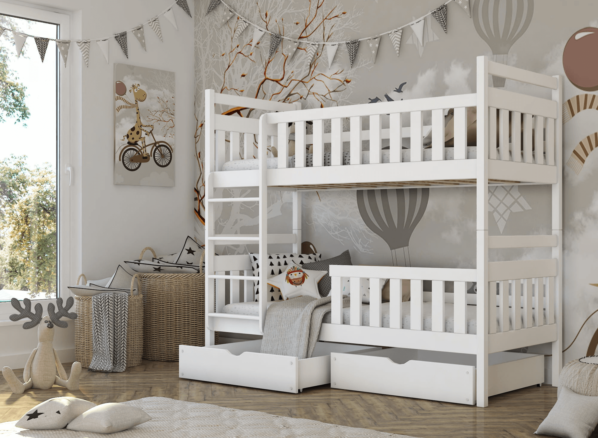 Kinderkamers zitten vol met kleuren en patronen. Daarom moet het meubilair in deze kamer neutraal zijn. Zo kunt u eenvoudig en voordelig de inrichting en stijl van deze bijzondere kamer veranderen. Het is voldoende om het beddengoed en de decoraties te veranderen en wij garanderen dat ons MONIKA stapelbed altijd perfect past.
