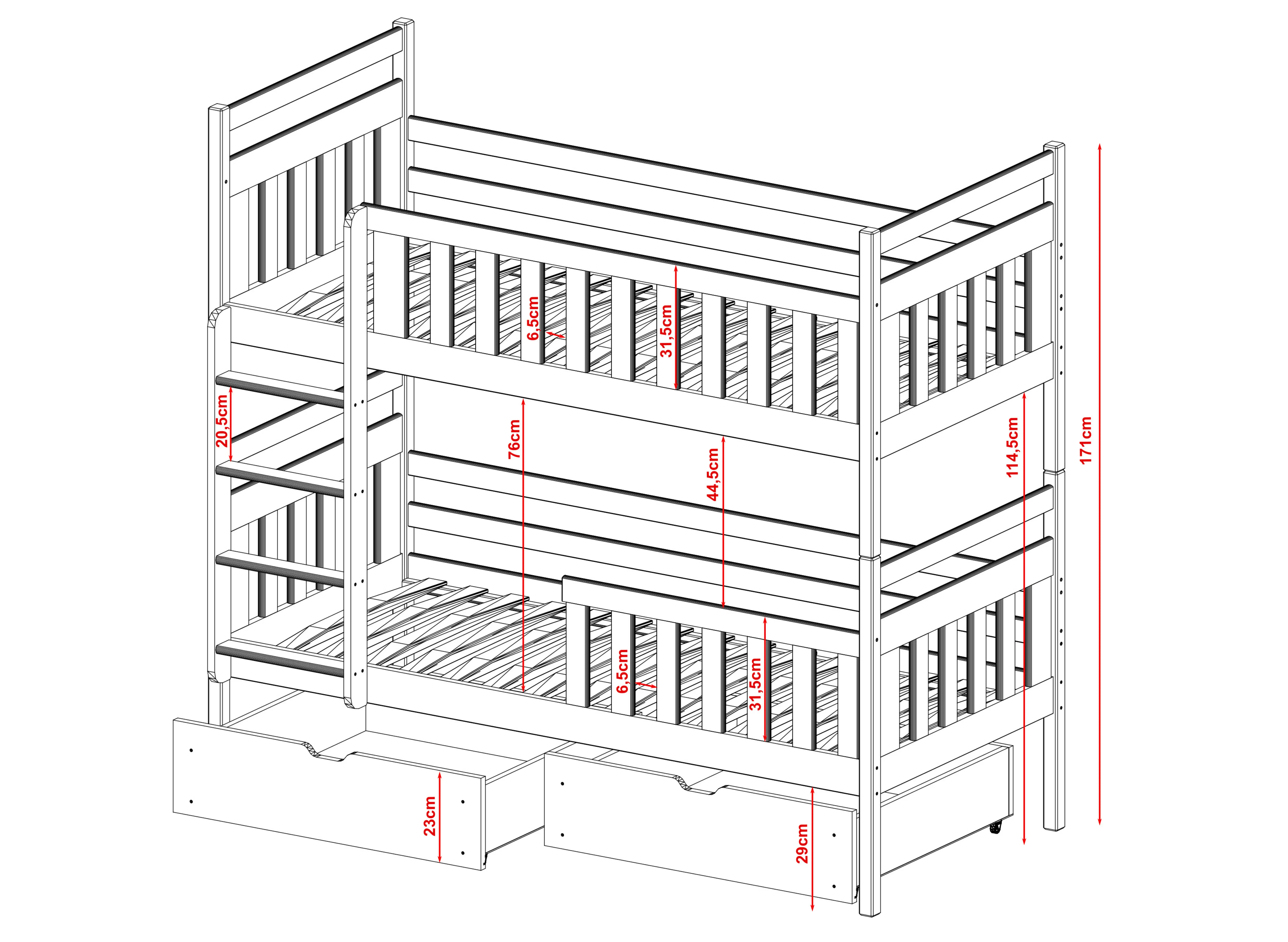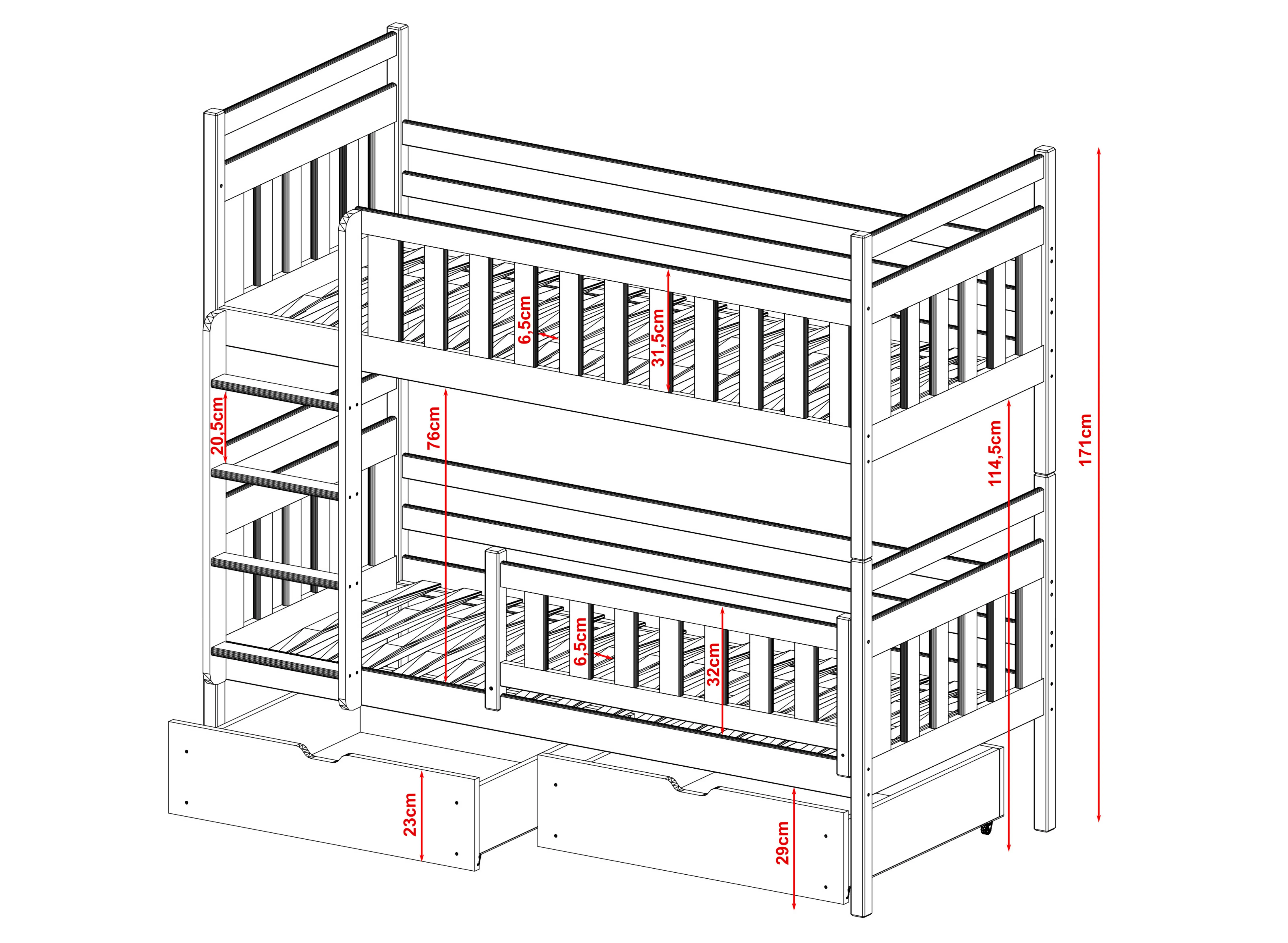 Het stapelbed MONIKA is niet alleen een uitstekende oplossing voor kleine ruimtes, maar ook voor elke kinderkamer waarin broertjes en zusjes wonen. Waarom? Zo’n bed stimuleert de fantasie en bevordert de creativiteit. Denk ook eens aan de praktische kant van het MONIKA stapelbed. U kunt beide delen los van elkaar inrichten, zodat u twee onafhankelijke slaapgedeeltes creëert. Wanneer u ons stapelbed MONIKA bestelt, geven wij u veel vrijheid. U kunt het meubelstuk personaliseren en aanpassen aan de behoeften van uw kinderen. U bepaalt zelf of de ruimte onder het bed voorzien moet worden van twee lades. Bij de bestelling bepaalt u ook of de leuningen van het stapelbed MONIKA vast gemonteerd of verwijderbaar moeten zijn.