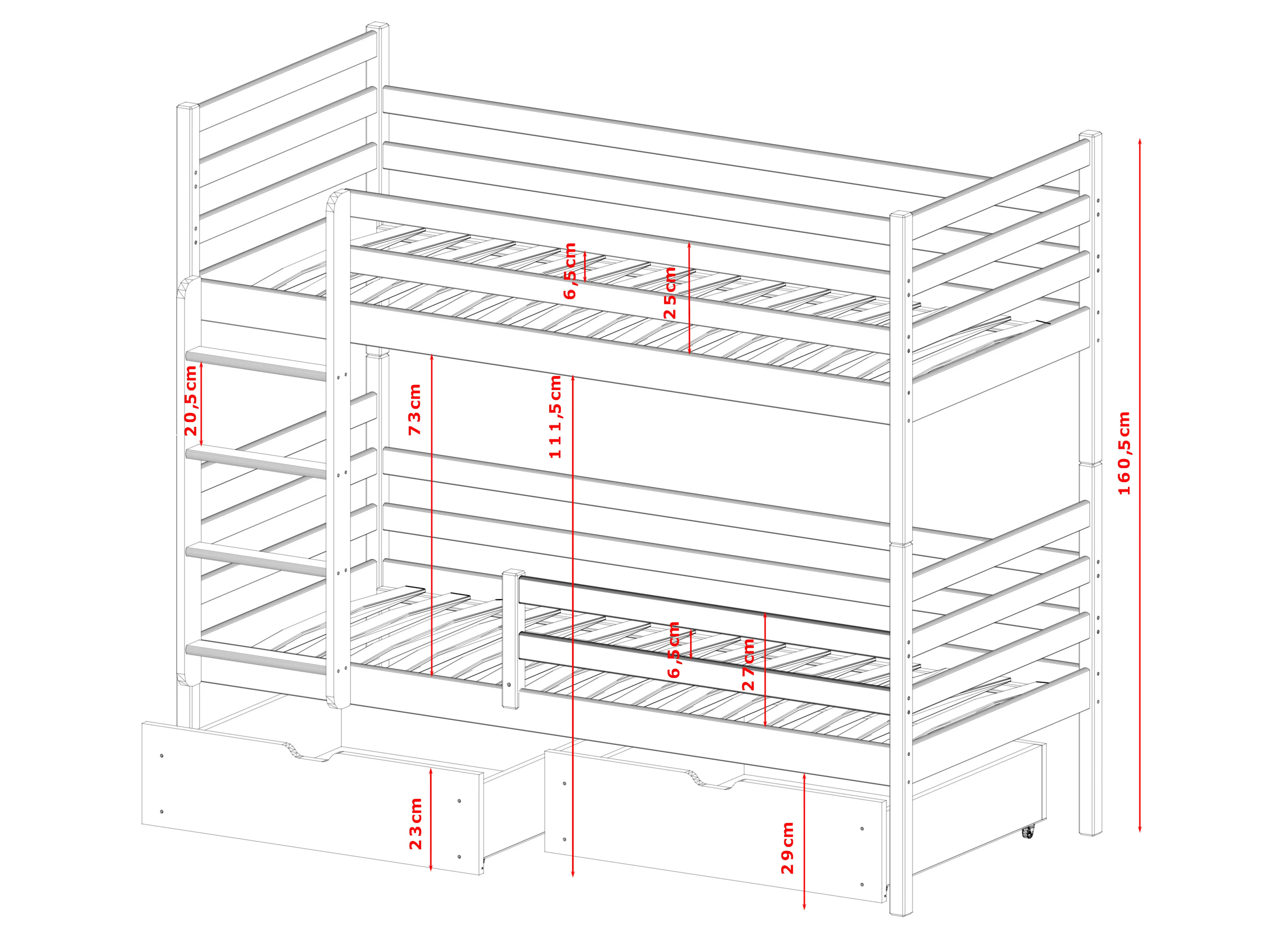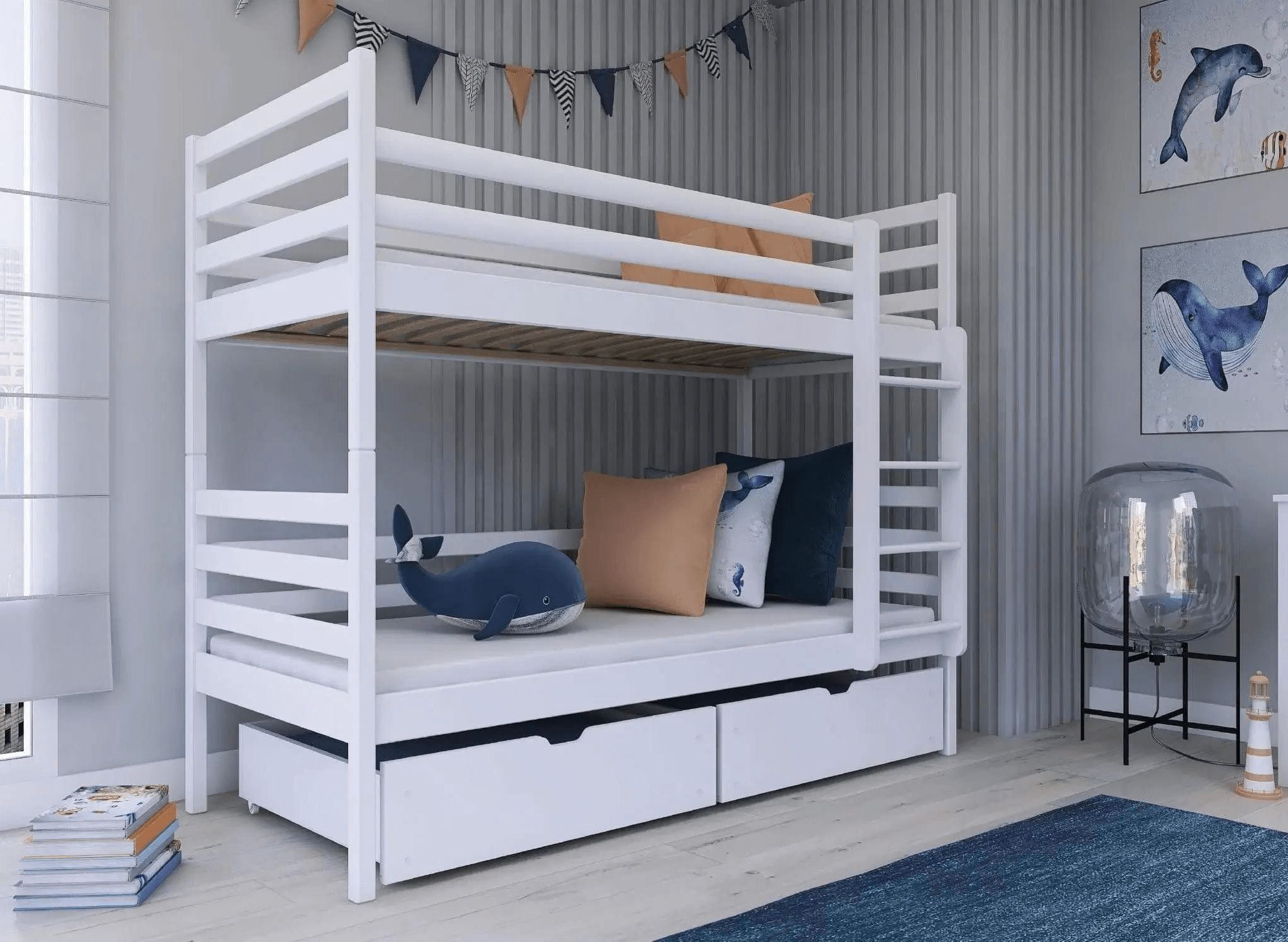 Laat u niet voor de gek houden. De droom van bijna ieder kind is een stapelbed. Het is een geweldig gevoel en een grote attractie om via een speciaal gevormde houten ladder naar de bovenste verdieping te klimmen. Het is echter raadzaam om alleen te kiezen voor beproefde en solide oplossingen van Lano Meubels, zoals het stapelbed NEMO. Het gepresenteerde NEMO kinderbed is meer dan alleen een plek om uit te rusten. Het biedt bovendien een praktische indeling van de ruimte en is een plek met veel attracties. Bovendien overtuigt het stapelbed NEMO door zijn unieke design. Niemand zal er toch onverschillig aan voorbijgaan? Het meubelstuk biedt twee comfortabele slaapplaatsen, zodat uw kinderen uitgerust en vol energie wakker worden. Ook vermeldenswaard zijn de twee ruime lades onder het bed. Ze zijn groot genoeg om gemakkelijk speelgoed, kinderaccessoires of diverse textiel in op te bergen.