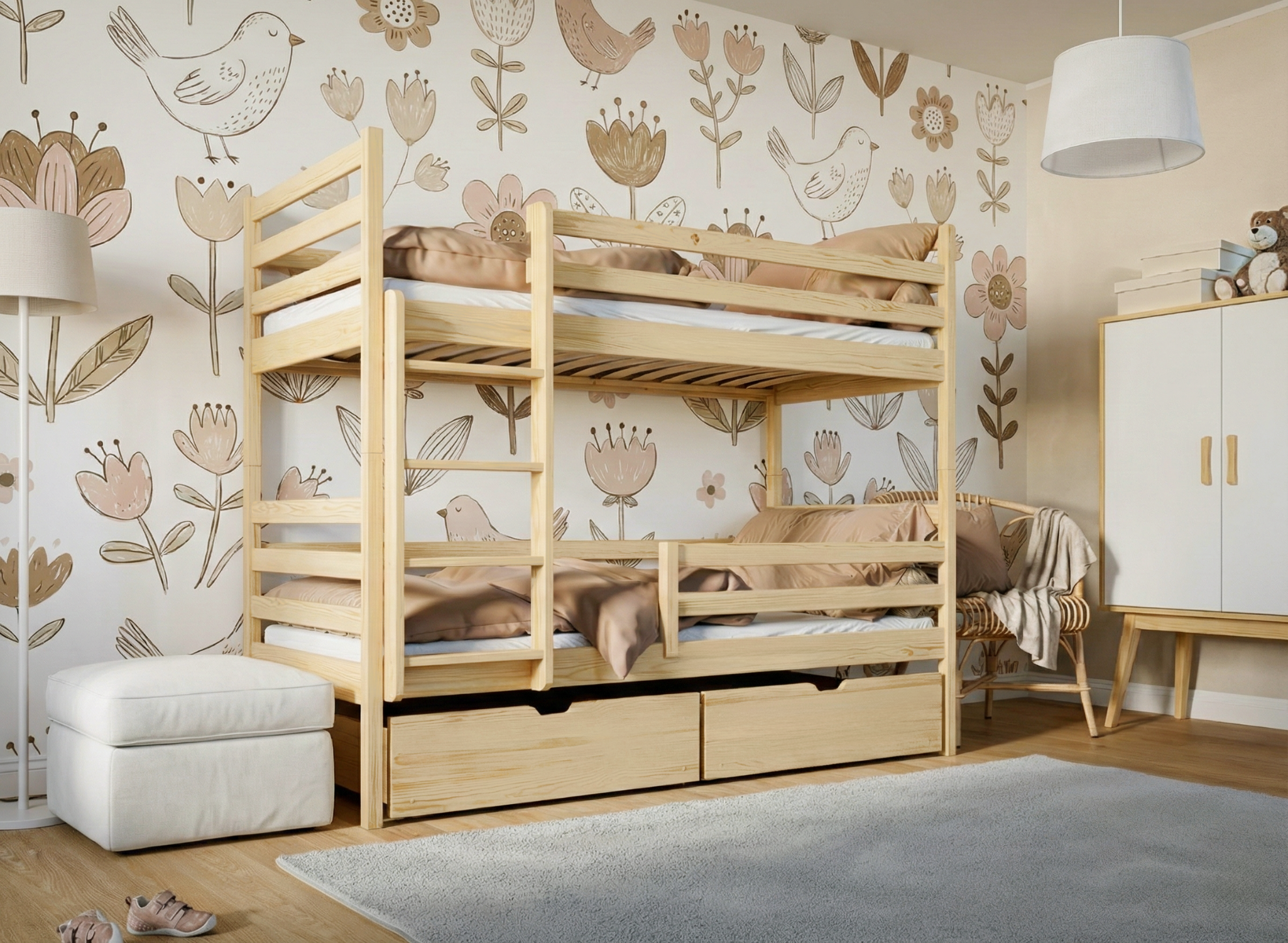 Het stapelbed NEMO is gemaakt van 100% grenenhout. In de praktijk betekent dit dat het bed uiterst solide en stabiel is. Extra veiligheidsmaatregelen in de vorm van houten leuningen beschermen het kind tijdens het slapen en geven ouders gemoedsrust. Indien nodig kan de onderste reling worden gedemonteerd. De planken zijn voorzien van een speciale lak die onschadelijk is voor de gezondheid van het kind. Bovendien zijn alle meubelranden afgerond, waardoor het risico op schaafwonden vrijwel nihil is.