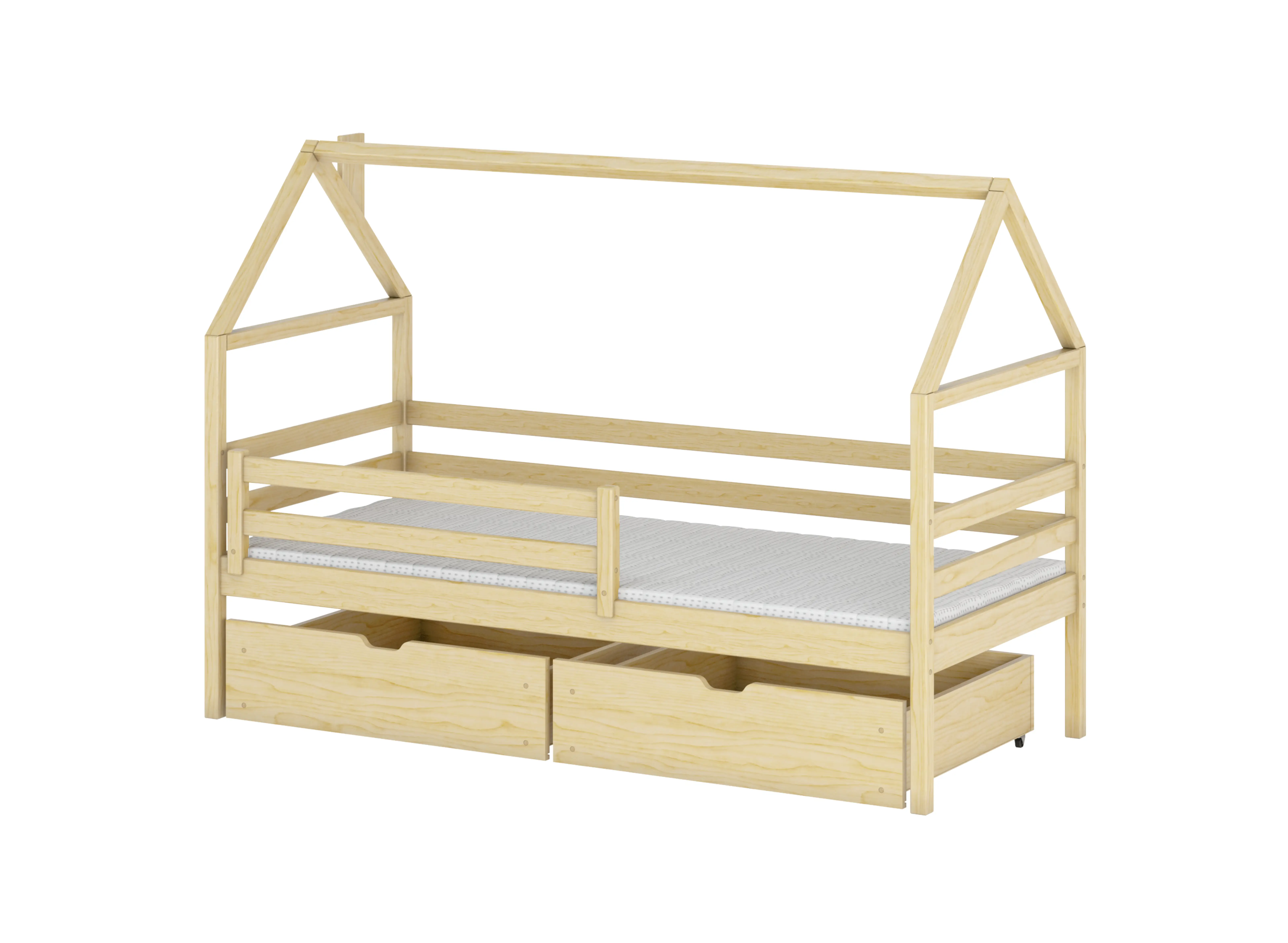 Het bed met de dakstructuur is niet alleen een decoratief element. Het kan ook gebruikt worden als onderdeel van een bescherming. De gehele constructie bestaat uit grenenhouten planken, die een stabiel frame voor de matras vormen. Het bedframe is omgeven door houten barrières, wat veiligheid biedt, zelfs voor de meest actieve kinderen. De constructie is zo ontworpen dat deze niet verschuift, zelfs niet als de peuter de grootste trucs uithaalt. De montage is uiterst eenvoudig. Je zou kunnen zeggen dat het kinderspel is! Naast een comfortabel en stevig bed, mag u ook de juiste matras niet vergeten. Het zorgt voor een rustige slaap en comfort. Weet u niet hoe u een matras moet kiezen voor uw geliefde? Niets is makkelijker. Kijk in het gedeelte WELKE MATRAS TE KIEZEN of neem contact met ons op.