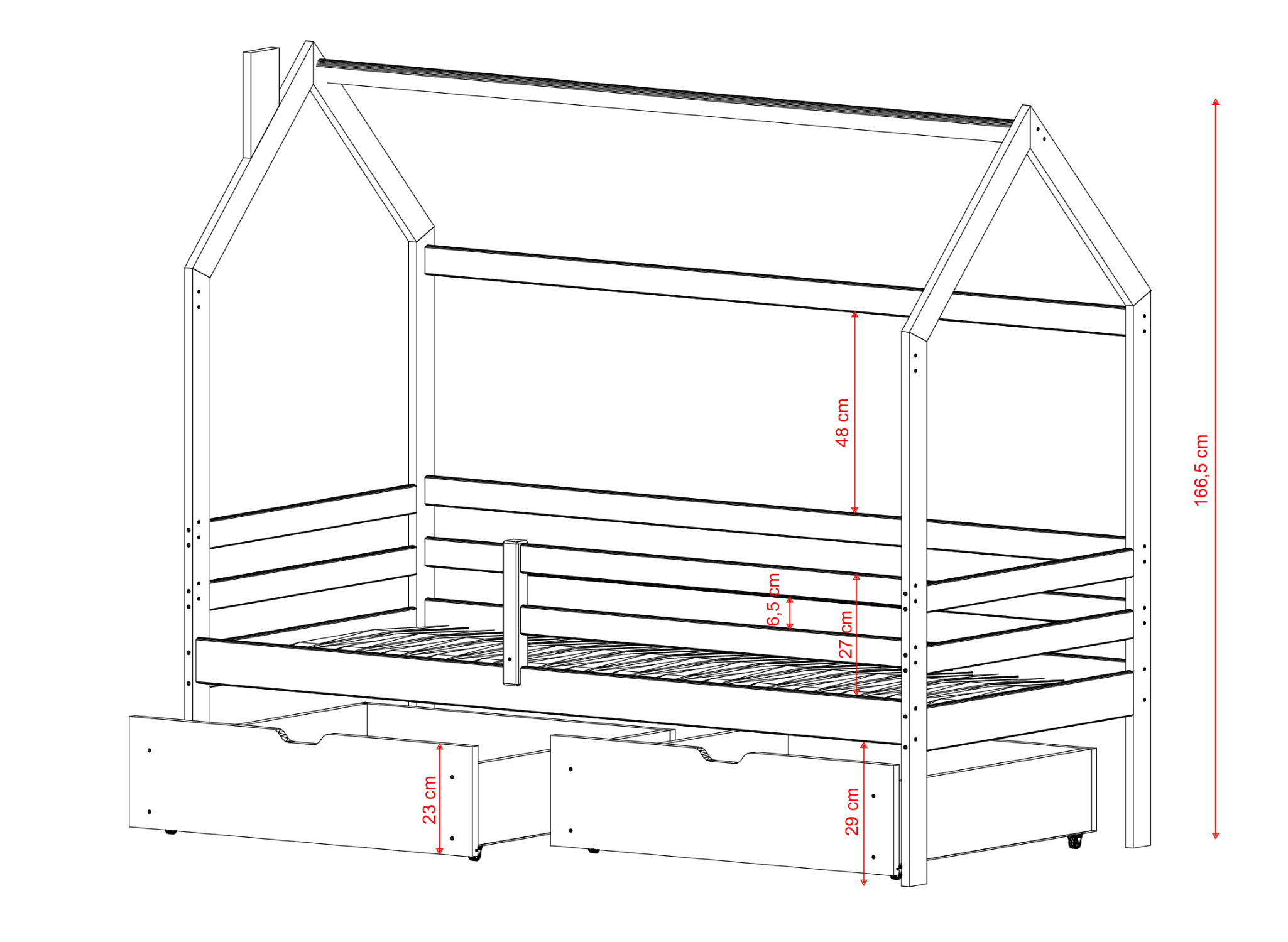 Als u ervoor wilt zorgen dat uw kind gezond slaapt, bedenk dan dat de kindermatras het belangrijkste onderdeel is van elk kinderbed. Na een dag spelen en leren heeft uw kleintje behoefte aan een comfortabel, hypoallergeen oppervlak waarop hij of zij veilig kan slapen. Voor het kinderbed in de vorm van een huis LILA van Lano Meubels kunt u onder andere kiezen uit schuimmatrassen, springverenmatrassen of matrassen met een kokosmatras. Onze experts helpen u graag bij het kiezen van het juiste model. De veiligheid van uw kind is onze topprioriteit. De houten leuningen die rond het frame van het LILA bedje in de vorm van een huis zijn bevestigd, voorkomen dat uw peuter per ongeluk van de rand van het matras glijdt. Als uw kind eerder in een bed met spijlen heeft geslapen, zal hij of zij het gemakkelijker vinden om te wennen aan een normaal bed. Zowel u als uw kind kunnen rustig slapen als het LILA kinderbed in de vorm van een huis in de buurt staat.