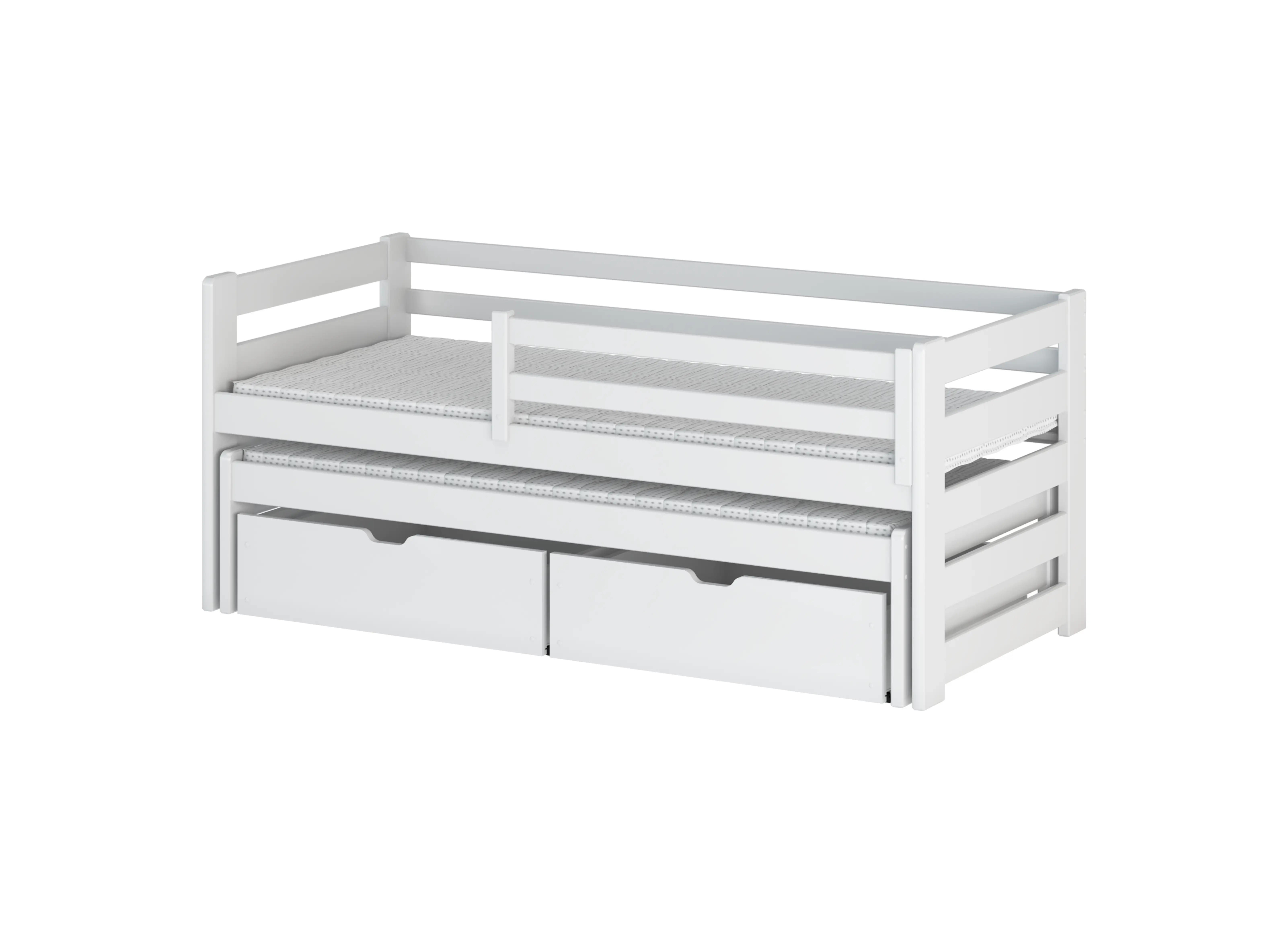 SENSO is een uitschuifbaar stapelbed van hout, ontworpen voor de kamer van een broertje of zusje. Het neemt weinig ruimte in beslag en is daarom ideaal voor kleine ruimtes. Het wordt gekenmerkt door een eenvoudige constructie en design, waardoor het visueel veelzijdig is en past bij elke interieurstijl. Het SENSO stapelbed heeft een uitschuifbaar platform, waardoor het een ideale plek is om tijd door te brengen gedurende de dag. 's Nachts kun je het omtoveren tot een slaapgedeelte met twee matrassen op verschillende hoogtes. Het is bedoeld voor een kamer die gedeeld wordt door twee broers en zussen. Dankzij de leuning kunt u hem ook met jongere kinderen gebruiken.