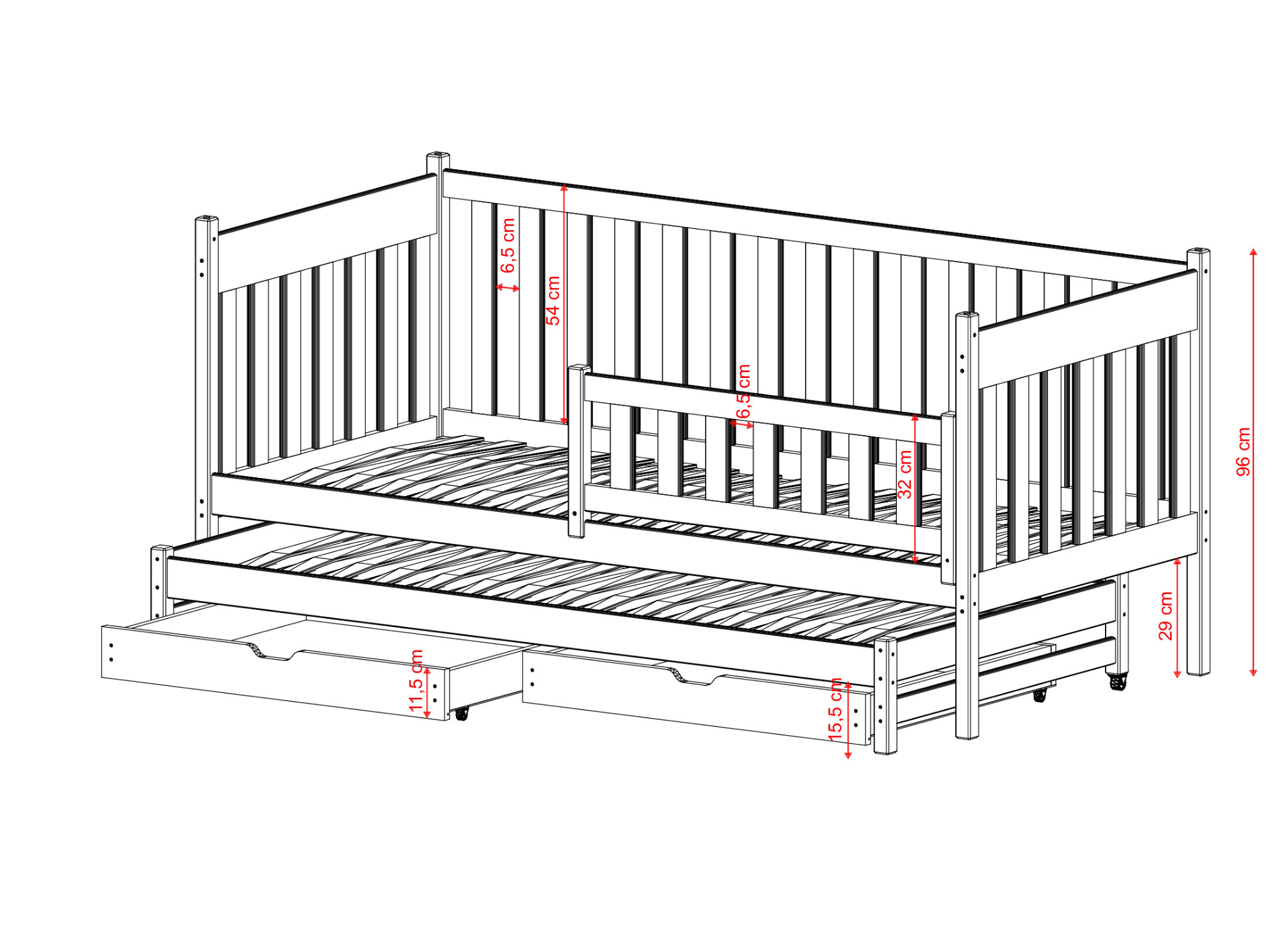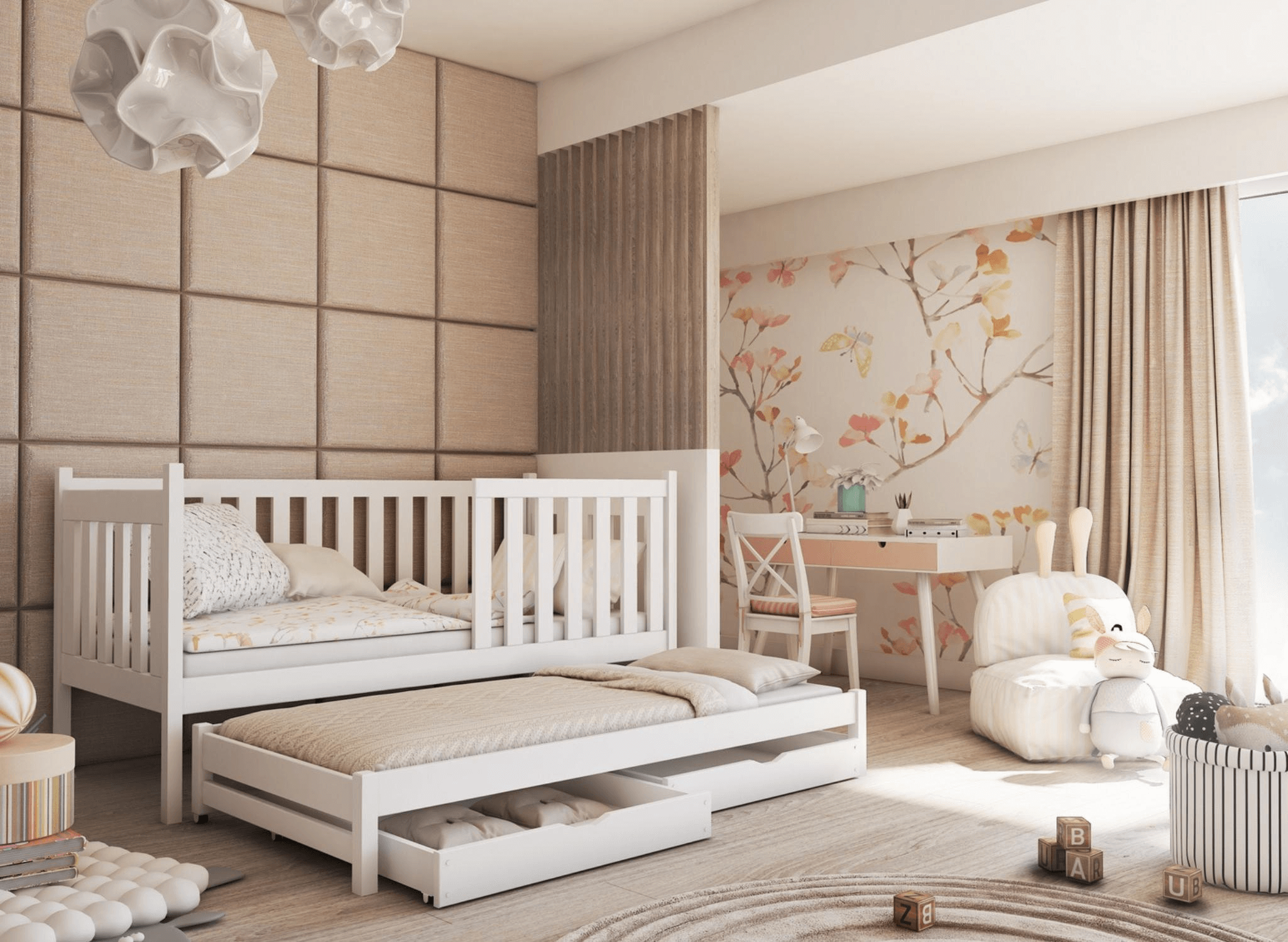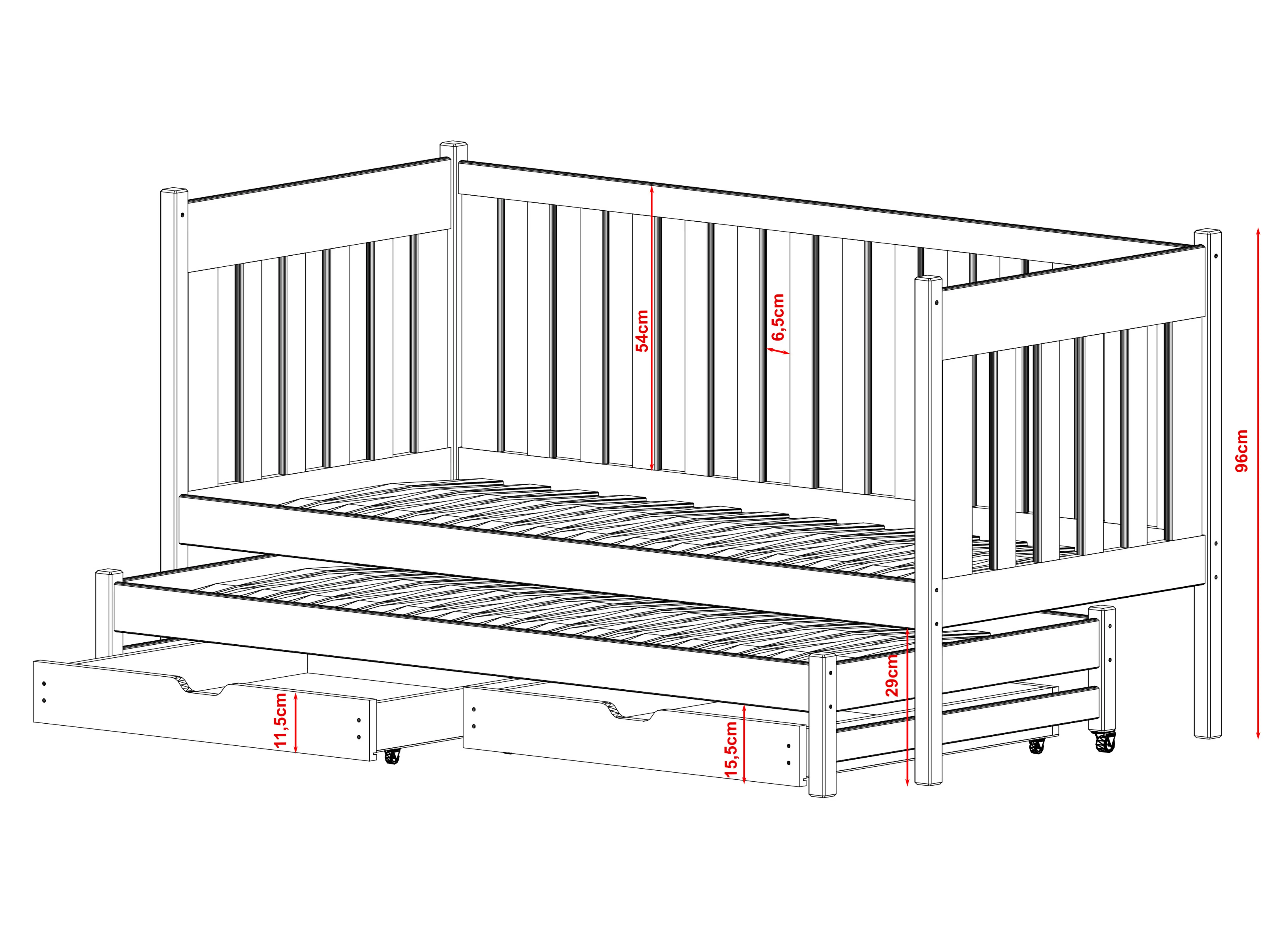 Het laag stapelbed KAJA is een alternatief voor twee eenpersoonsbedden en een traditioneel hoog stapelbed. Het neemt weinig ruimte in beslag en de ruimte boven het meubelstuk kan gebruikt worden om planken, decoraties of verlichting te monteren. Een ideale optie voor broers en zussen, voor een kamer waar elke vierkante meter bijzonder waardevol is. Het KAJA stapelbed is ontworpen om uw kinderen lang van dienst te zijn. U kunt de optie met leuning in verschillende varianten kiezen. Een volledige leuning is ideaal voor de allerkleinsten. Een kortere versie is daarentegen een uitstekende keuze voor iets oudere peuters. Voor oudere kinderen en tieners kunt u de leuning volledig demonteren. Dit is het KAJA broer-/zusbed dat je niet hoeft te verschonen en ook niet wilt verschonen.
