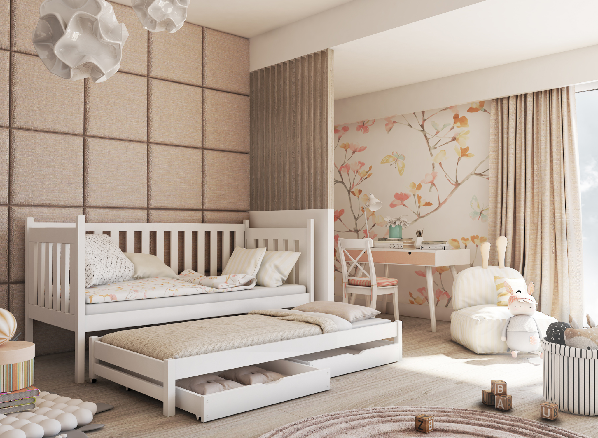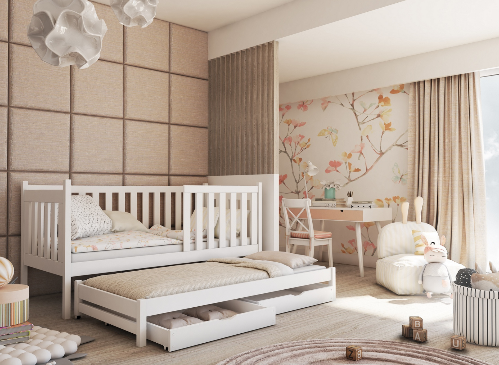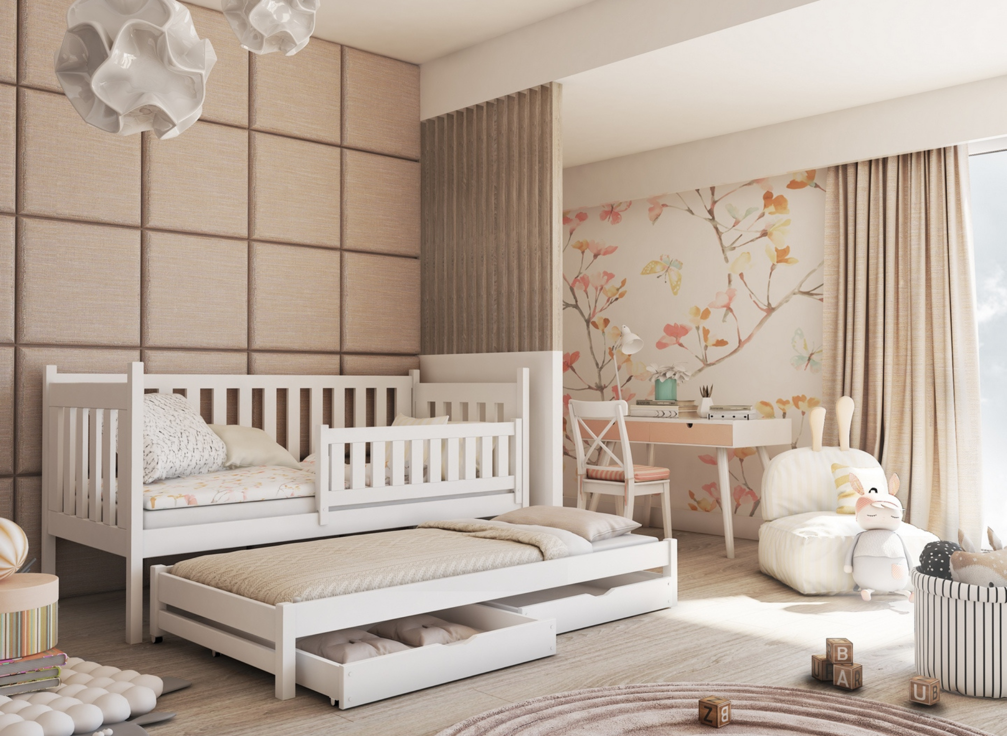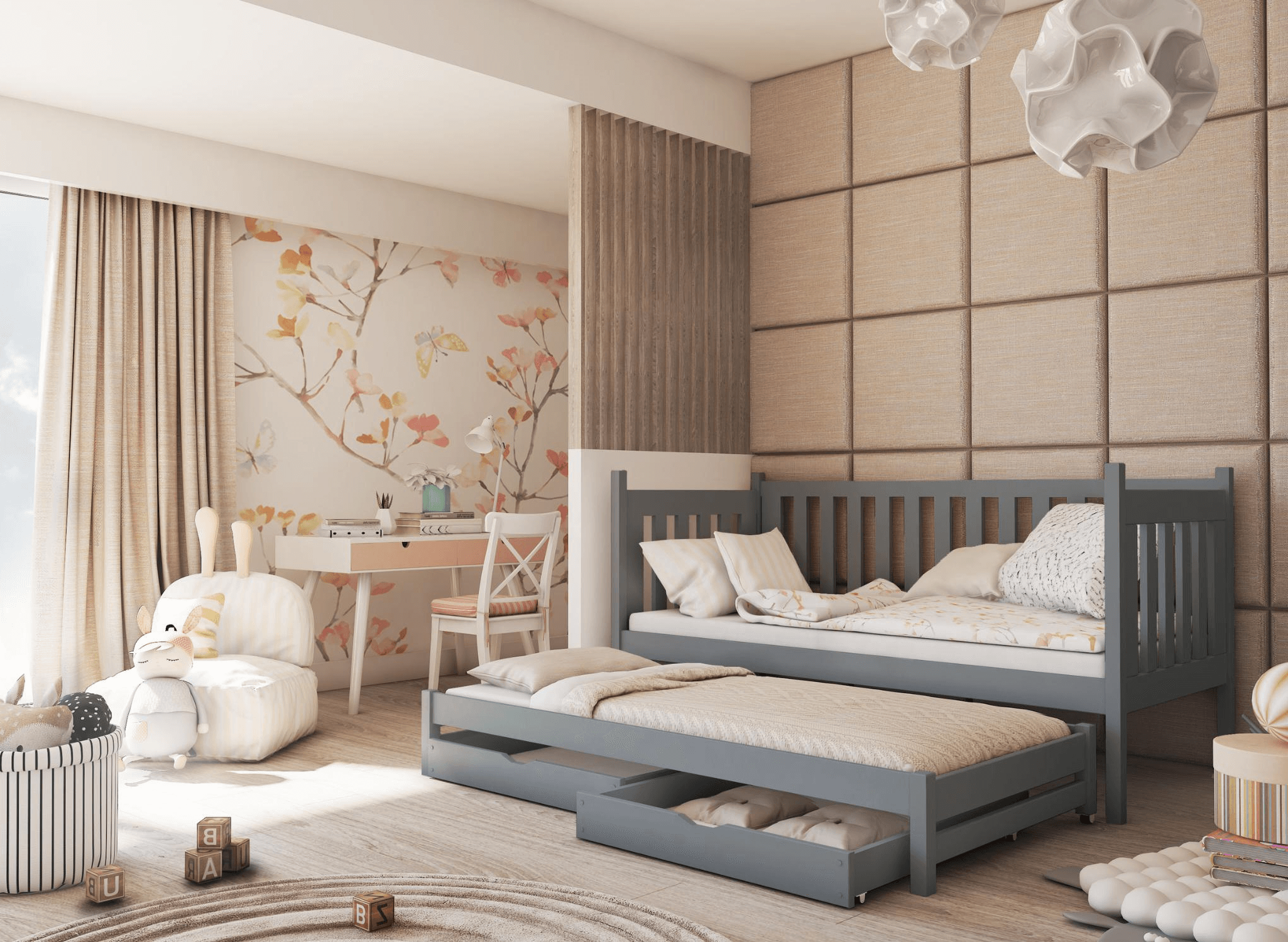 Het laag stapelbed KAJA is een alternatief voor twee eenpersoonsbedden en een traditioneel hoog stapelbed. Het neemt weinig ruimte in beslag en de ruimte boven het meubelstuk kan gebruikt worden om planken, decoraties of verlichting te monteren. Een ideale optie voor broers en zussen, voor een kamer waar elke vierkante meter bijzonder waardevol is. Het KAJA stapelbed is ontworpen om uw kinderen lang van dienst te zijn. U kunt de optie met leuning in verschillende varianten kiezen. Een volledige leuning is ideaal voor de allerkleinsten. Een kortere versie is daarentegen een uitstekende keuze voor iets oudere peuters. Voor oudere kinderen en tieners kunt u de leuning volledig demonteren. Dit is het KAJA broer-/zusbed dat je niet hoeft te verschonen en ook niet wilt verschonen.