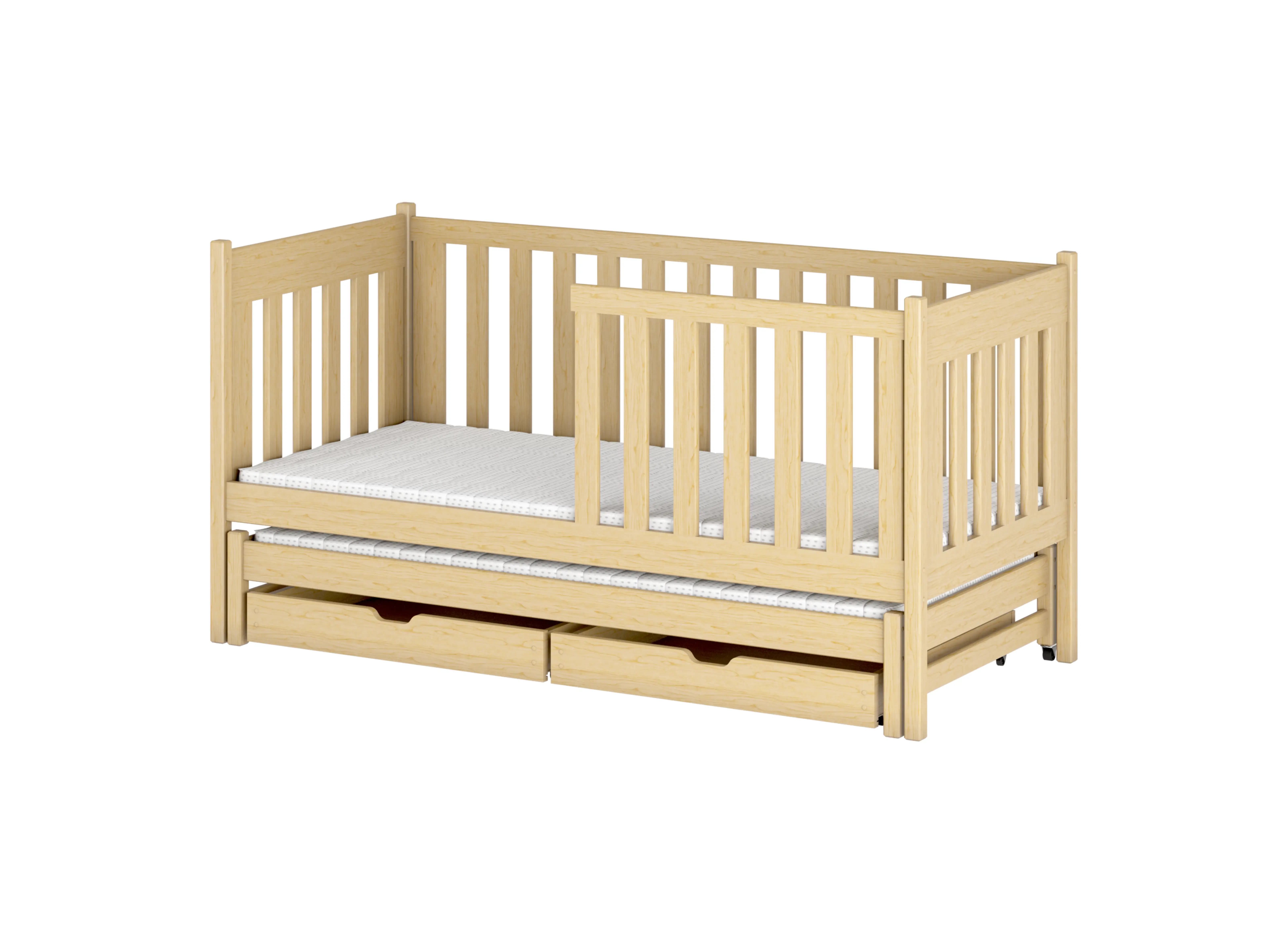 Om het KAJA stapelbed nog functioneler te maken, kunt u kiezen voor uitschuifbare lades. Dit biedt extra opbergruimte voor kleding, speelgoed en beddengoed. De lades zijn ruim en werken onafhankelijk van elkaar, zodat elk broertje of zusje zijn eigen lade heeft. Het lage stapelbed KAJA is gemaakt van natuurlijk grenenhout. Dit materiaal is uiterst robuust en mechanisch resistent. De constructie van het KAJA uitschuifbare stapelbed is duurzaam en kan kleine en grote lasten goed weerstaan, zodat uw kinderen er jarenlang plezier van kunnen hebben.