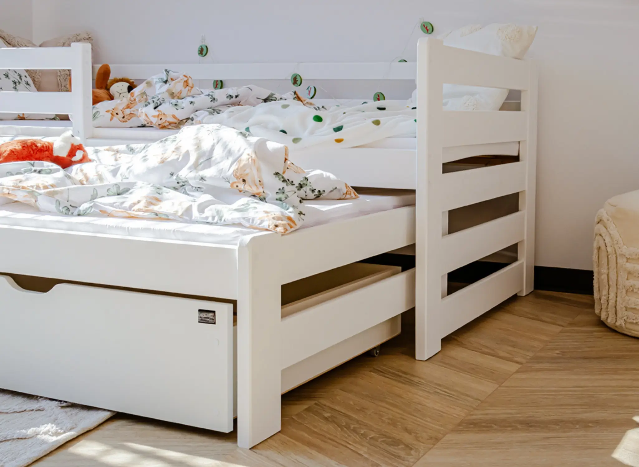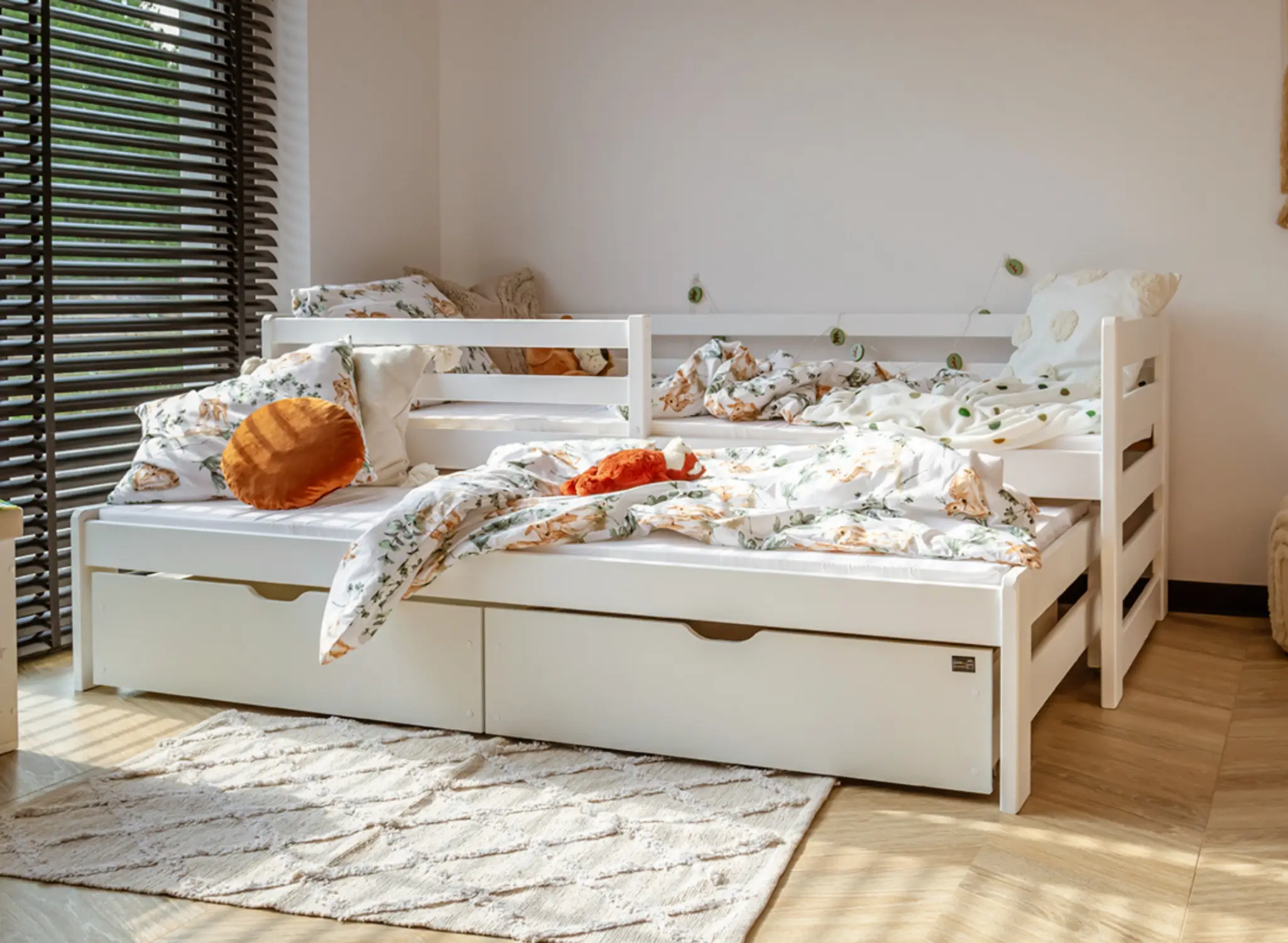 Het SENSO stapelbed is gemaakt van grenenhout, waardoor het robuust en duurzaam is. Het is dus een investering voor de lange termijn die in eerste instantie kan dienen als stapelbed voor kinderen en later ook geschikt kan zijn voor tieners. Het frame onder de matras bestaat uit flexibele berkenhouten latten, waardoor het veerkrachtig is. Het uitschuifbare SENSO stapelbed is een goed alternatief voor twee aparte bedden in de kamer wanneer de ruimte beperkt is. Het neemt evenveel ruimte in beslag als standaard eenpersoonsbedden. Optioneel kan het worden uitgerust met ruime lades om bijvoorbeeld beddengoed, speelgoed of kleding in op te bergen.