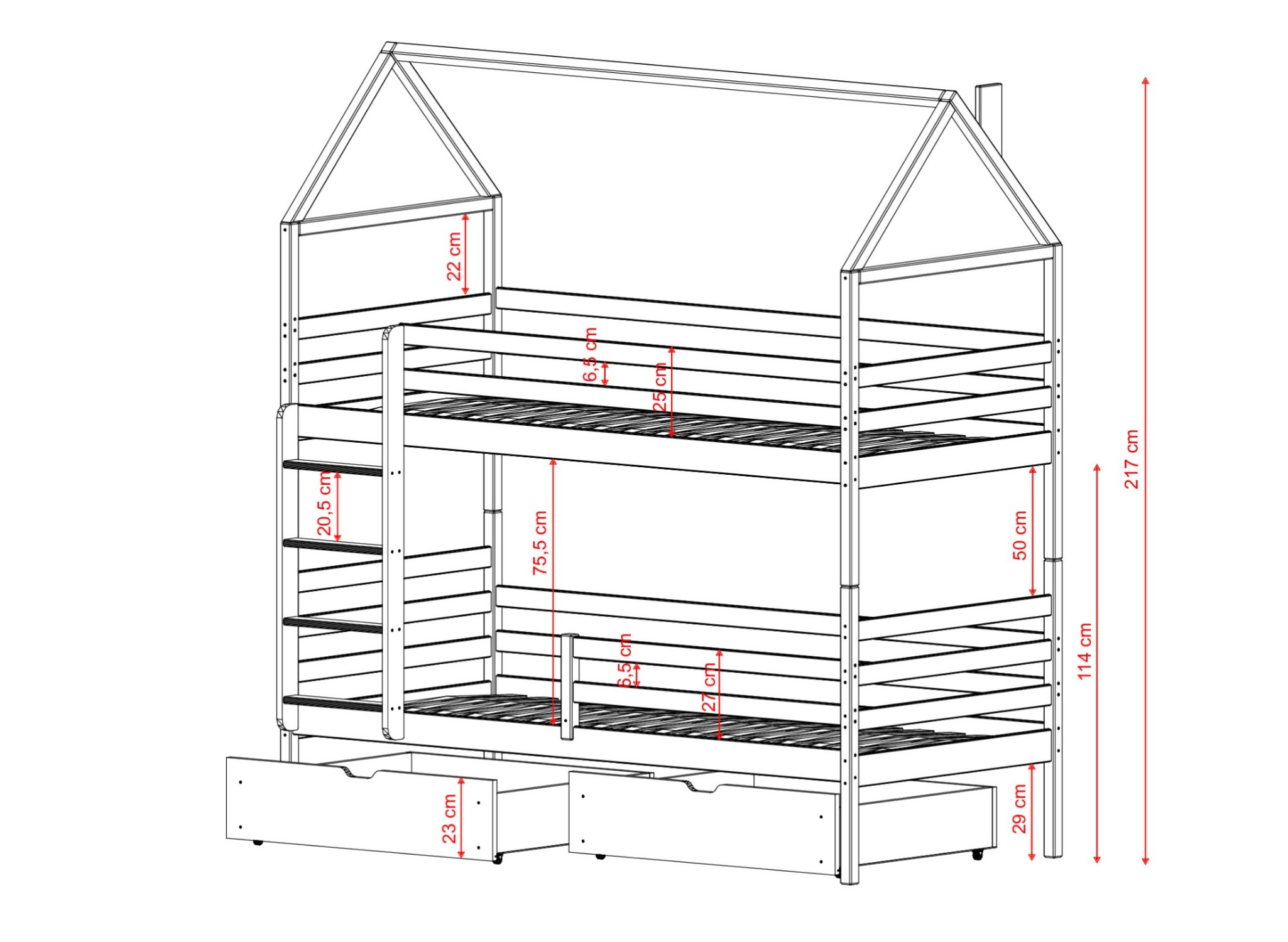 Kinderbed huisje ALEX is de droom die uitkomt voor elk kleintje. Het is een doordachte en zorgvuldig vervaardigde constructie die de creativiteit stimuleert en de zintuigen prikkelt. De hoge duurzaamheid en stabiliteit maken het een meubelstuk voor kinderen dat jarenlang probleemloos gebruikt zal worden. We garanderen ook dat elk kind elke dag blij zal zijn met dit bed. Bij Lano Meble hechten we niet alleen veel waarde aan het visuele aspect, maar vooral aan de functionaliteit van kinderbedden. Daarom biedt het stapelbed huisje ALEX niet alleen een comfortabele nachtrust, maar ook een veilige plek om diverse spullen op te bergen. Onder het ALEX kinderbed bevinden zich praktische lades waarin beddengoed, kleding en talloze speeltjes opgeborgen kunnen worden. Je zult geen last meer hebben van rondslingerende spullen in de kamer; voortaan is er altijd een plekje voor.