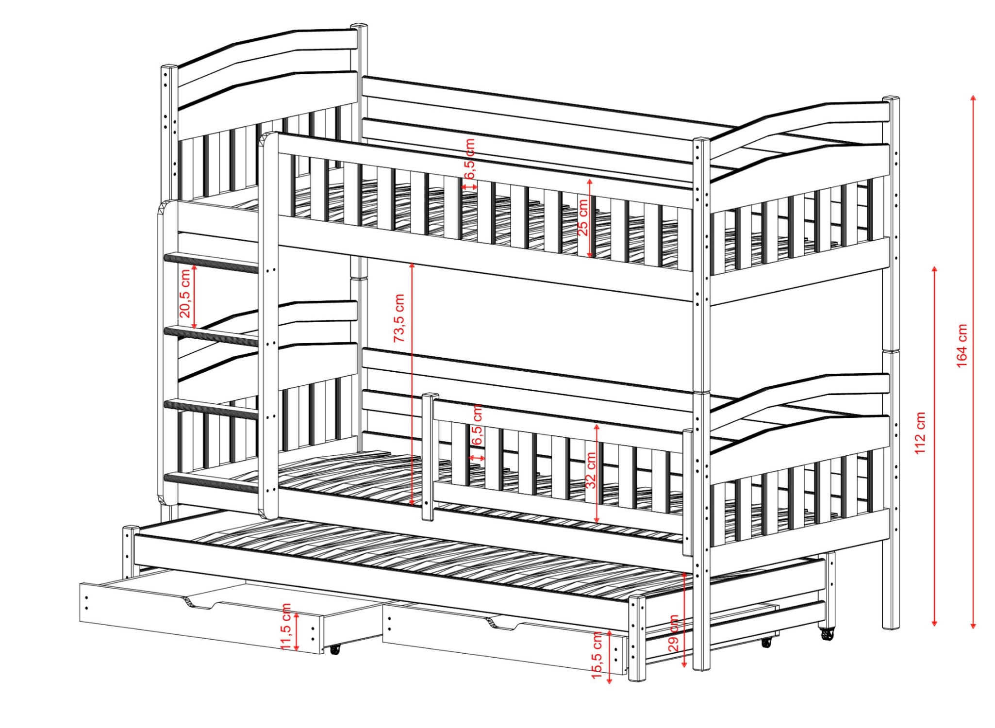 Onderaan het driepersoons stapelbed BLANKA kunnen zich uitschuifbare laden bevinden, mits je voor die variant kiest. Hun ruime interieur biedt plaats aan veel spullen die de kinderkamer rommelig maken, zoals ongebruikt speelgoed of dekens die je alleen in de winter gebruikt. De extra, uitschuifbare matras onderaan wordt een onschatbare hulp wanneer je kind vrienden uitnodigt voor een logeerpartij – het biedt gasten comfort zonder dat er extra luchtbedden aan te pas hoeven te komen.