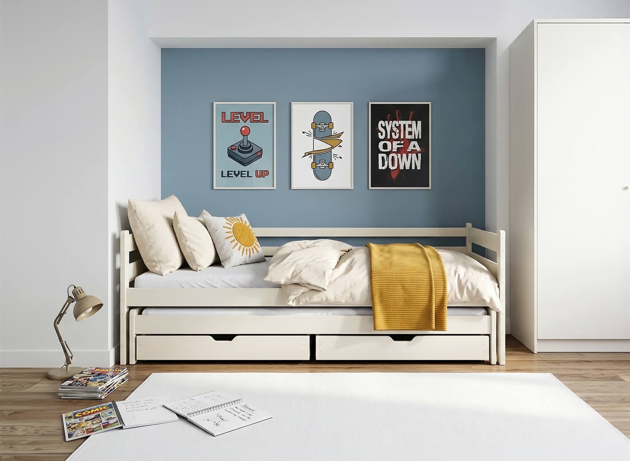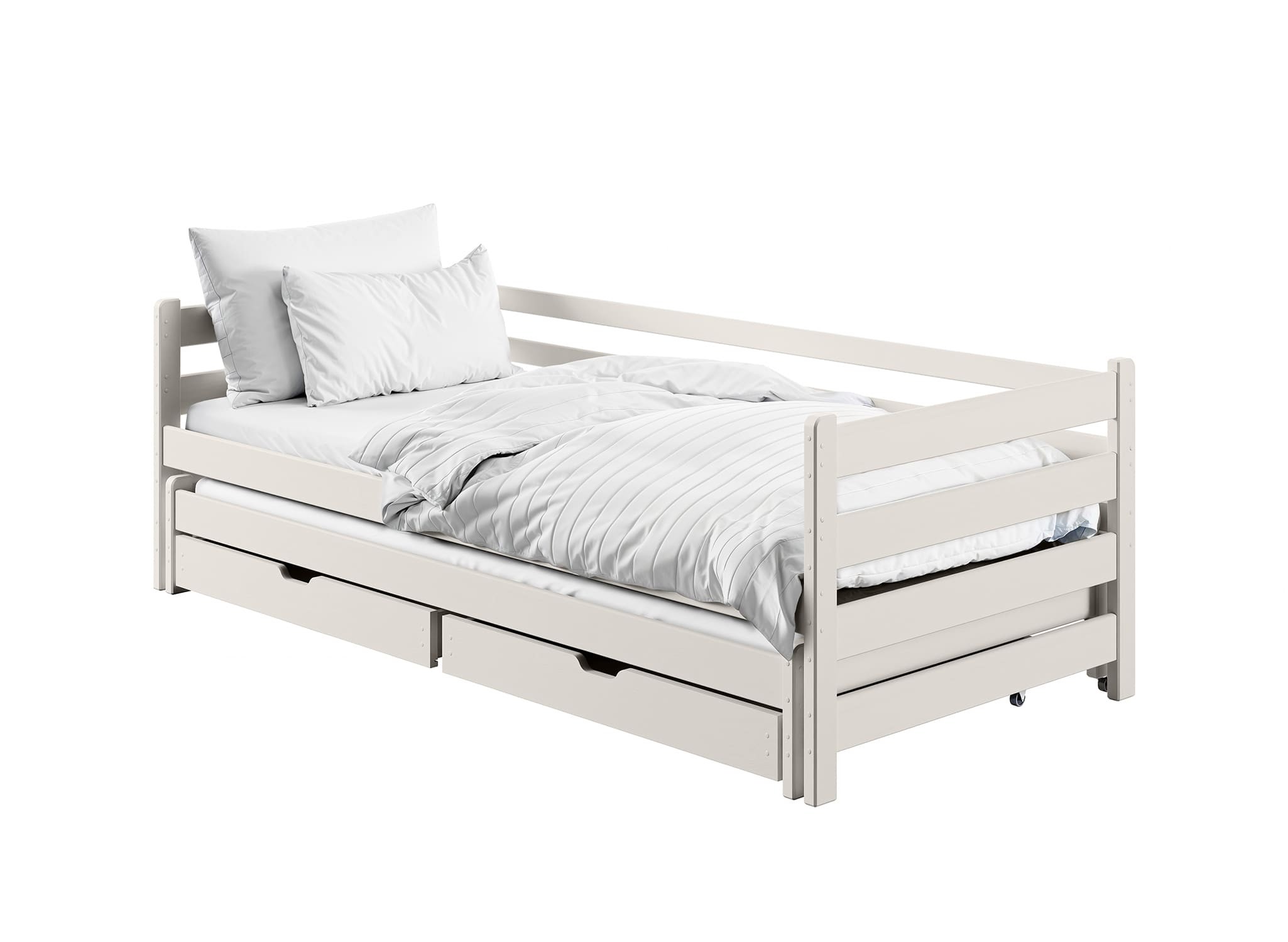 HABI is een functioneel houten bed met een uitschuifbaar slaapplatform, ideaal voor de kamer van broertjes en zusjes. Dankzij de compacte vorm past het perfect in kleine ruimtes. Het eenvoudige ontwerp en de universele stijl zorgen ervoor dat het harmonieus in elk interieur past, ongeacht de inrichting. Dankzij het uitschuifbare onderste gedeelte kan het bed overdag dienen als een comfortabele ontspanningsplek. 's Avonds verandert het echter in een nachtelijke ruimte met twee comfortabele slaapplaatsen op verschillende hoogtes. Het HABI bed is uitgerust met een veiligheidshekje, wat het ook een geweldige oplossing maakt voor jongere kinderen door hen veiligheid en comfort te bieden.