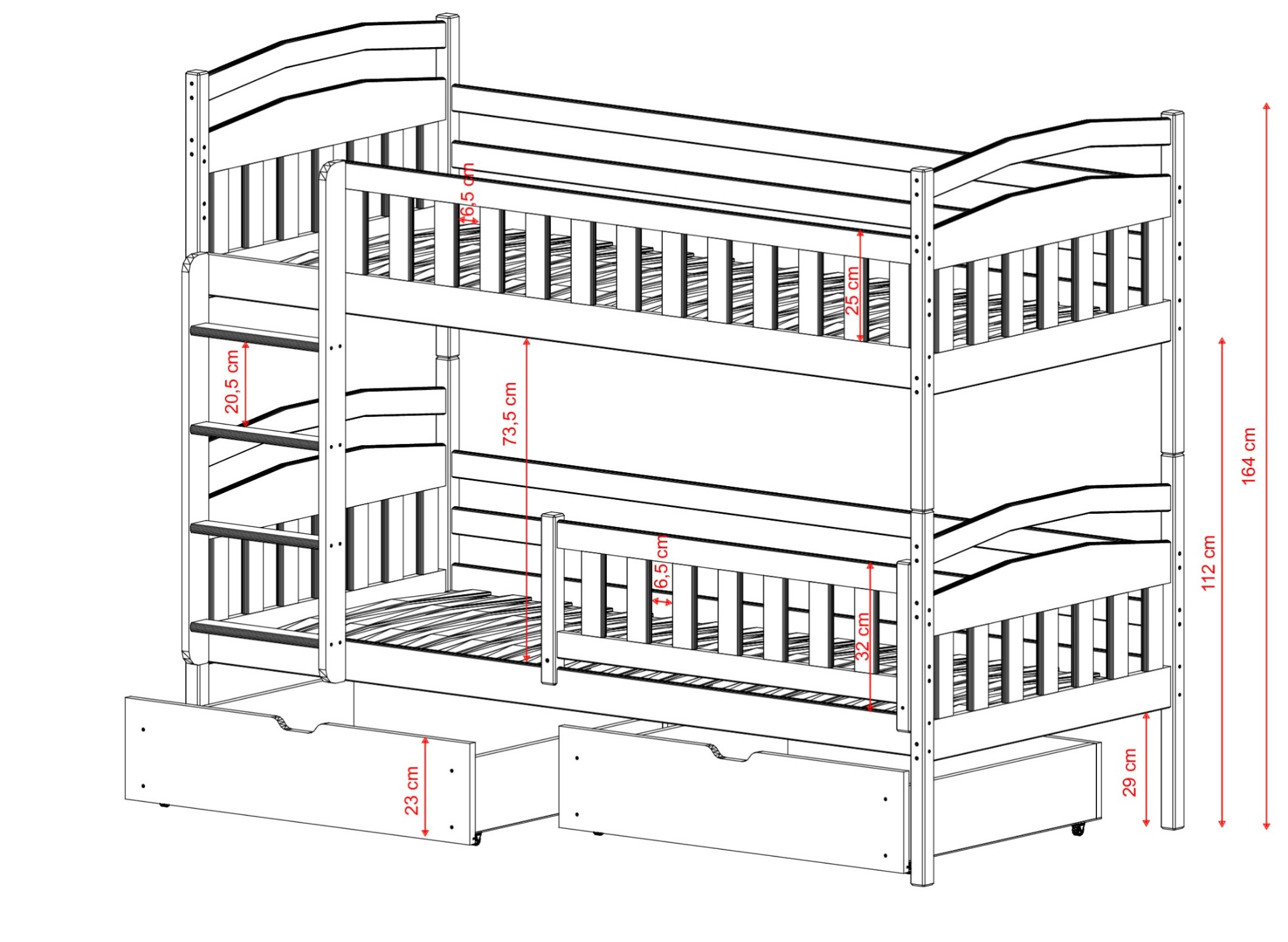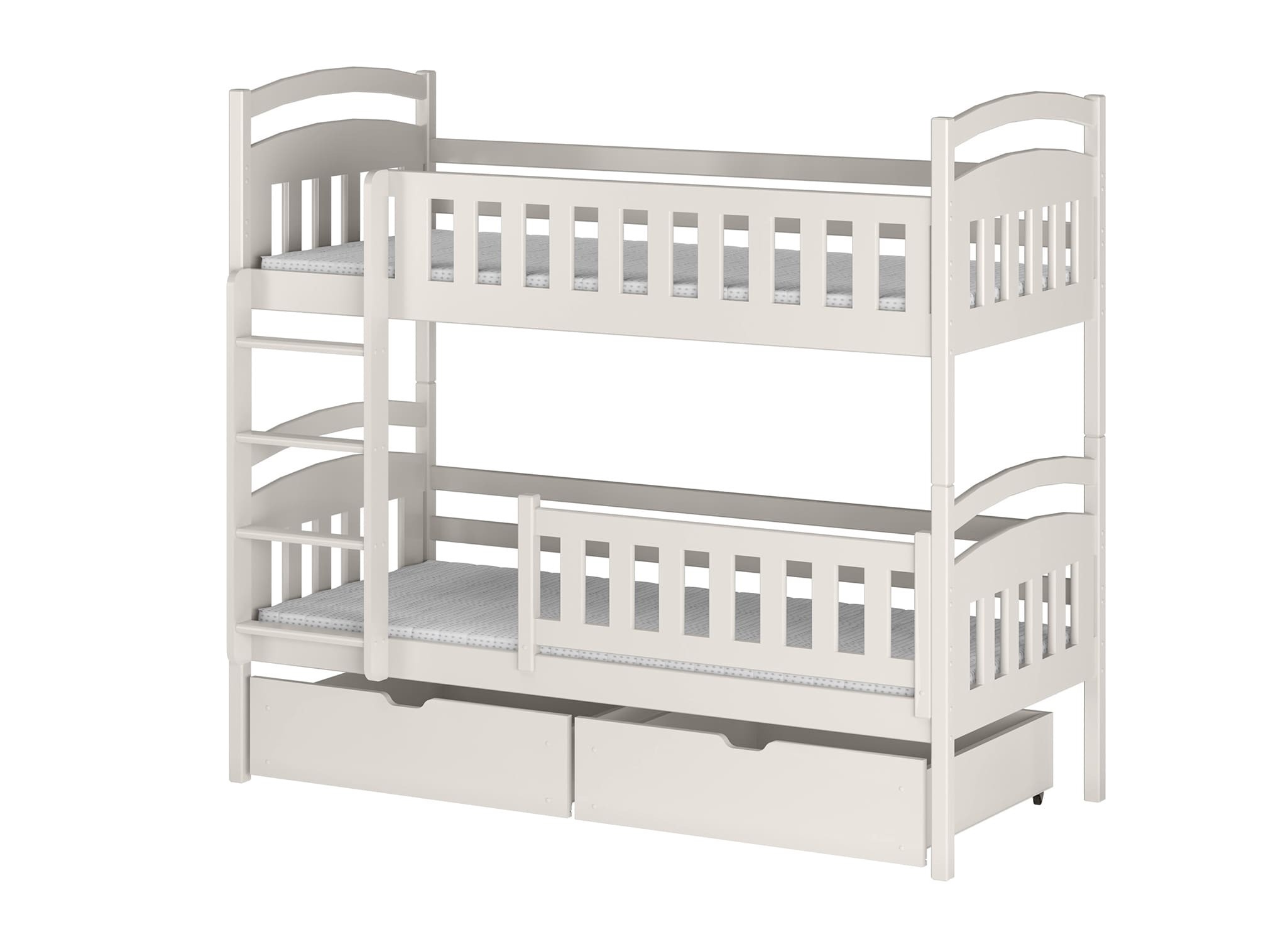 Opbergruimte heb je nooit genoeg. Dat is ook ons uitgangspunt, daarom zijn onze bedden niet alleen mooi en stevig, maar ook praktisch. Bij het bestellen van het IGNAŚ stapelbed kun je bijpassende laden kiezen qua stijl en karakter. Door hun breedte en hoogte kun je er moeiteloos het reservebeddengoed van je kinderen in opbergen. De laden zijn voorzien van wielen, wat het uitschuiven onder de bedden aanzienlijk vergemakkelijkt, en de minimalistische handgreep voegt elegantie toe aan de laden. Het IGNAŚ stapelbed van Lano Meble is ook aangepast aan de behoeften van jongere kinderen. Beide delen van het bed zijn voorzien van een houten hekje, zodat zelfs de kleintjes die onrustig slapen en veel draaien veilig zijn. Maar dat is niet alles: wanneer je kinderen groter worden, kun je de uitvalbeveiliging van het onderste gedeelte snel demonteren, wat het in- en uitstappen vergemakkelijkt.