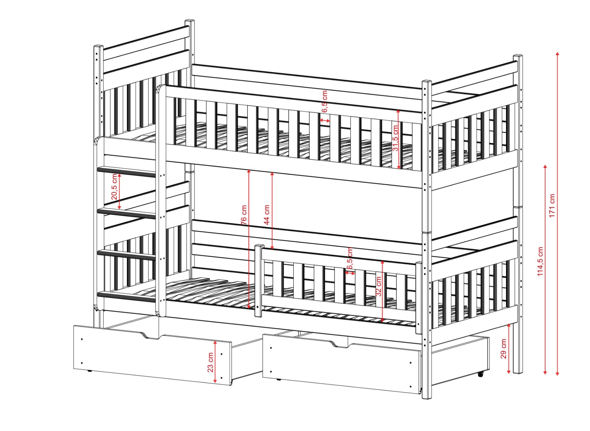 Het stapelbed MONIKA is de perfecte oplossing, niet alleen voor kleine ruimtes, maar voor elke kinderkamer waar broertjes of zusjes wonen. Waarom? Zo'n bed prikkelt de fantasie en ondersteunt de creativiteit. Kijk ook naar de praktische kant van het MONIKA bed voor broertjes en zusjes. Je kunt beide delen uit elkaar halen en zo twee onafhankelijke slaapzones creëren. Bij het bestellen van ons MONIKA stapelbed geven we je veel vrijheid. Je kunt het meubel personaliseren, zodat het precies past bij de behoeften van je kinderen. Jij beslist of de ruimte onder het bed wordt afgewerkt met twee laden. Tijdens het bestelproces beslis je ook of de uitvalbeveiliging van het MONIKA stapelbed vast gemonteerd of afneembaar moet zijn.