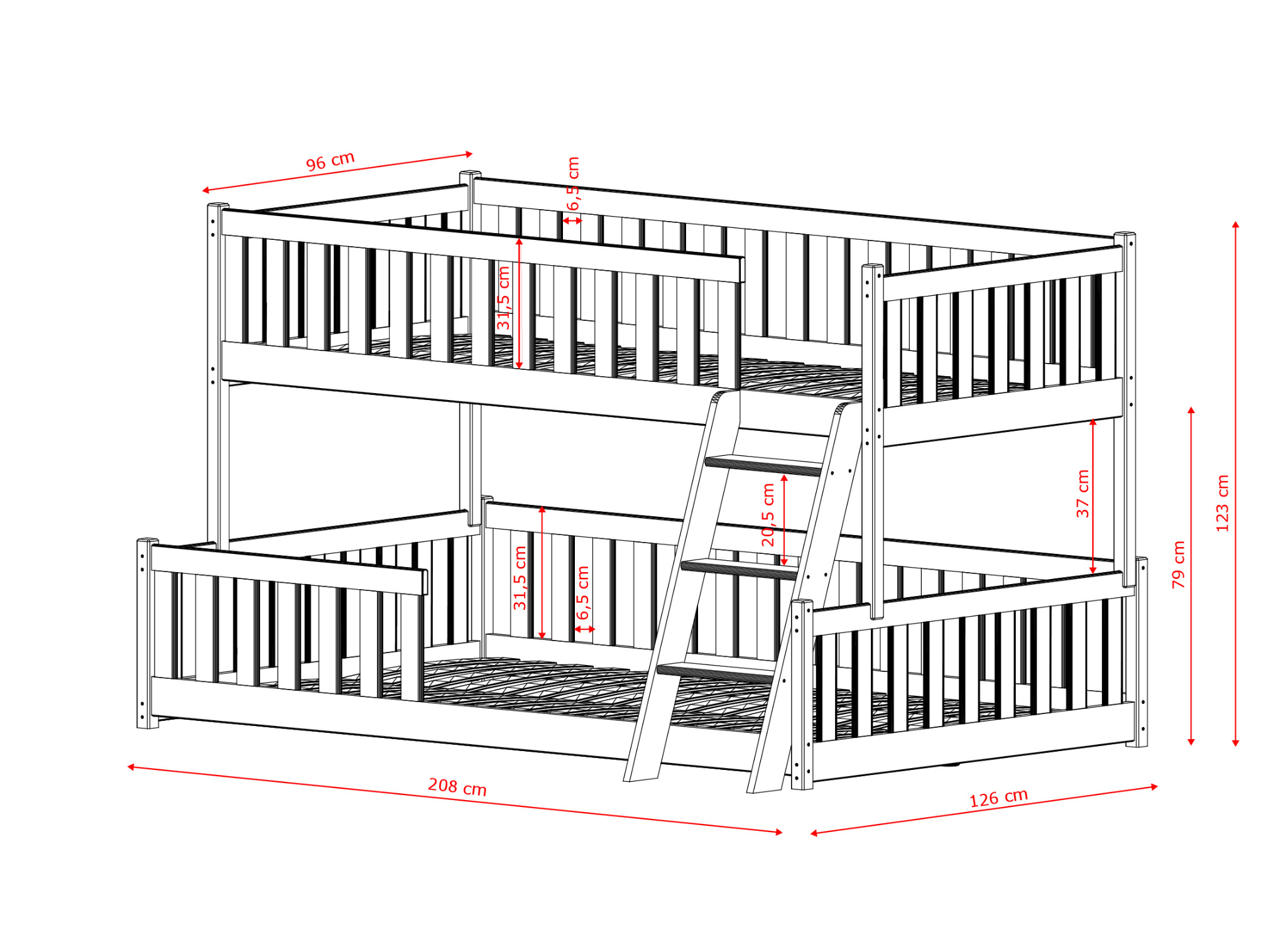 Het kenmerk van het NICE stapelbed van Lano Meble is de unieke constructie en matrasmaat. De bovenste matras meet 90x200 cm, terwijl de onderste matras 120x200 cm meet. Het bed heeft een eenvoudig design met verticale rails, zonder onnodige versieringen. Dit maakt het perfect voor zowel peuter- als tienerkamers. Het NICE katoenen stapelbed vormt de perfecte achtergrond voor elk beddengoed, dat je naar eigen inzicht kunt aanpassen. Bij het inrichten van een kinderkamer is het verstandig om te kiezen voor universele meubels – zo kun je, door simpelweg de accessoires te veranderen, het interieur afstemmen op de interesses van je kinderen. Veiligheid in de geest van Montessori – het NICE katoenen stapelbed van Lano Meble. Je kinderen zullen dol zijn op het NICE model vanwege de ruimte, en jij op de gemoedsrust die het biedt. Het is een vloerbed, waarbij het onderste slaapgedeelte zich dicht bij de grond bevindt. Hierdoor kunnen zelfs de jongste kinderen veilig en zelfstandig in bed klimmen, en hoef je je geen zorgen te maken over pijnlijke valpartijen tijdens het slapen of spelen. Voor wie hoger wil klimmen, is er een schuine ladder. Dit maakt de toegang tot het bovenste niveau stabiel en comfortabel. Bij het ontwerpen van meubels bij Lano Meble combineren we de behoefte van een kind aan avontuur met de behoefte van een ouder aan veiligheid. Het NICE-bed is een stabiele veilige haven die, dankzij de lage structuur, het interieur niet overheerst en een gezellige sfeer creëert die bevorderlijk is voor ontspanning.