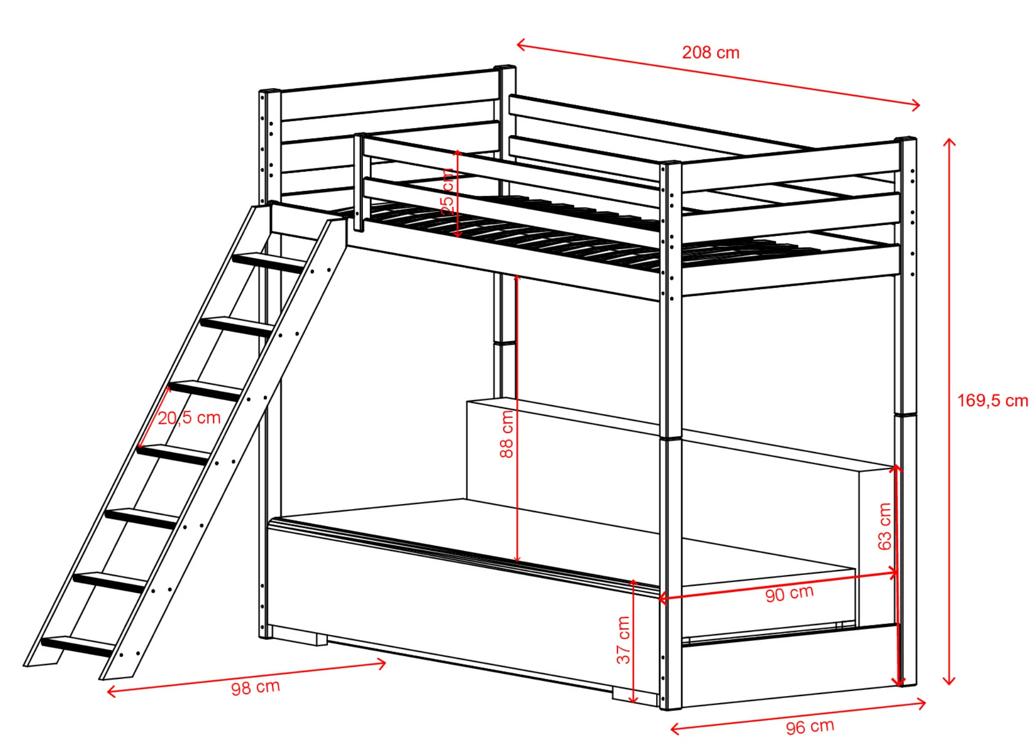 Dit stapelbed met sofa is ontworpen met het oog op dagelijks gebruik. Dankzij het hoogslaper-ontwerp met uitklapbare bank kun je twee aparte zones creëren: boven een plek om te slapen, en beneden een relaxzone. De stabiele ladder hindert het uitklappen van het onderste gedeelte niet, en drie grote kussens vormen een comfortabele rugleuning tijdens het zitten. Onder de zitting bevindt zich een praktische opbergbak voor beddengoed die helpt om de kamer netjes te houden – ideaal in plaats van extra lades of kasten.